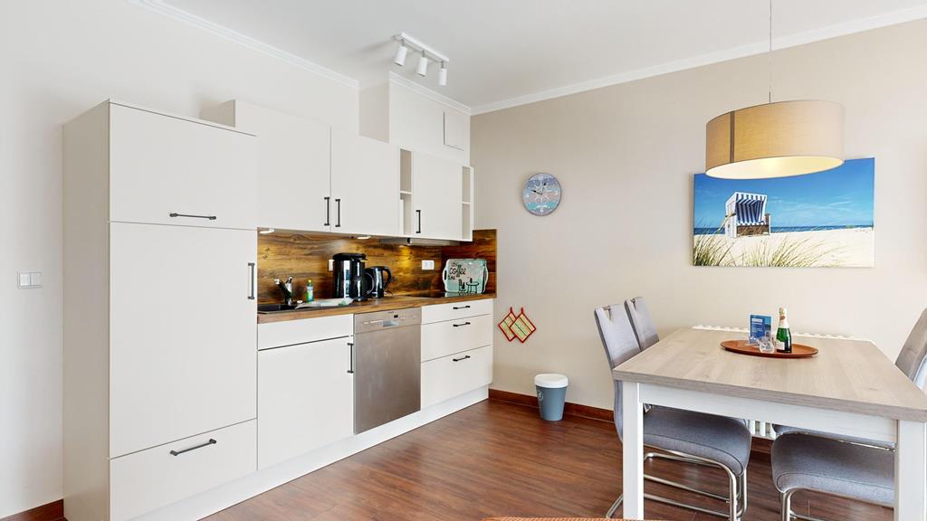 - Küche: Moderne Küchenzeile, Ceran-Kochfeld, Spülmaschine, Kühlschrank mit Gefrierfach, Mikrowelle mit Back- und Grillfunktion, Kaffeemaschine, Toaster, Wasserkocher