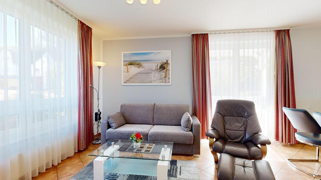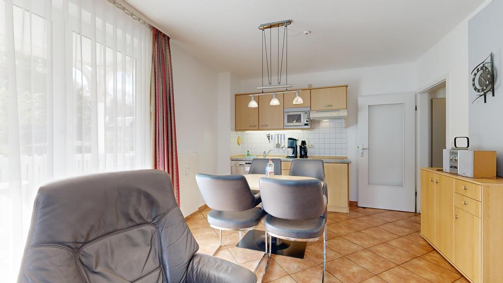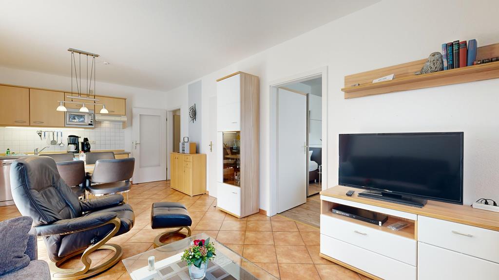 - Wohnzimmer: Couchgarnitur (Schlafgelegenheit für 2 Personen), Kabel-TV, Stereoanlage, Internetanschluss-WLAN, Esstisch