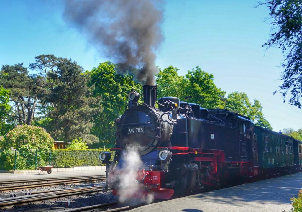 Seit mittlerweile weit mehr als 100 Jahren dampft die Rügensche Kleinbahn, auch liebevoll „Rasender Roland“ genannt, mit 30 km/h Höchstgeschwindigkeit durch den landschaftlich reizvollen Südosten der Insel Rügen.