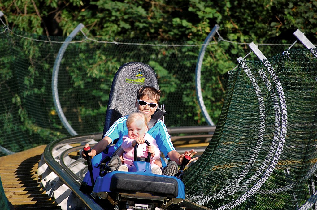 Eine 700 Meter lange Rodelstrecke mit sieben Steilkurven, mehreren Jumps und einem Aktionskreisel