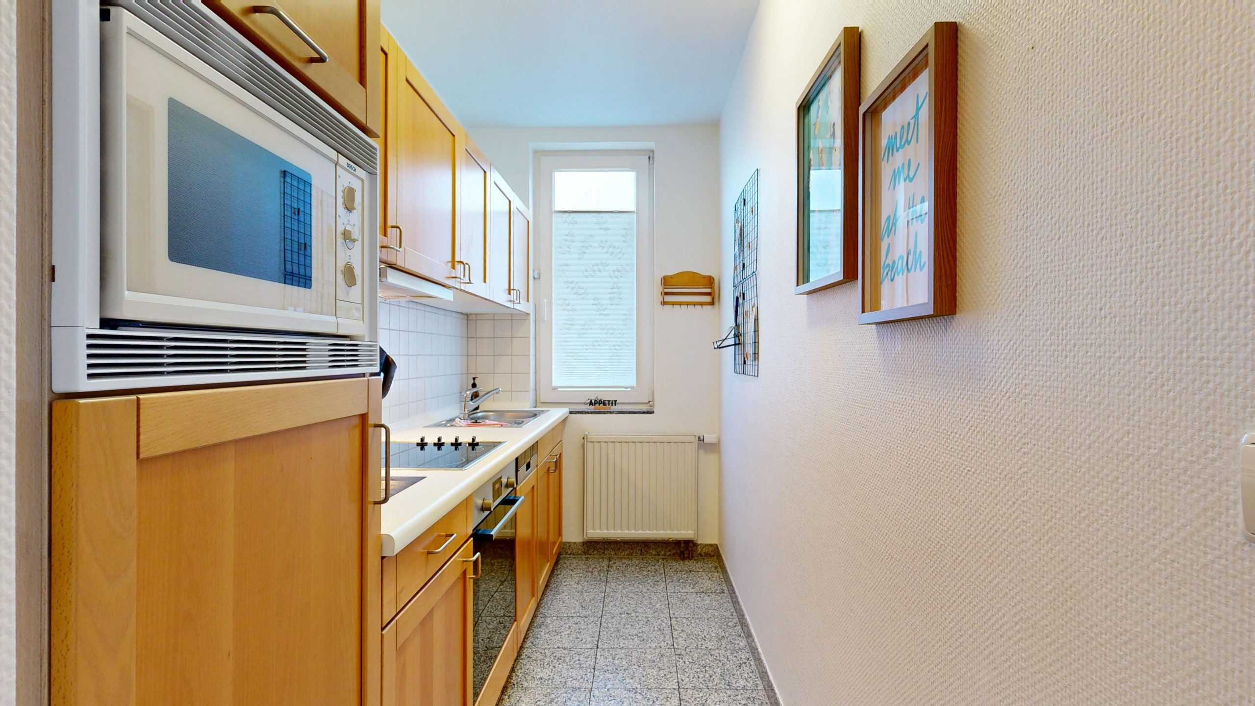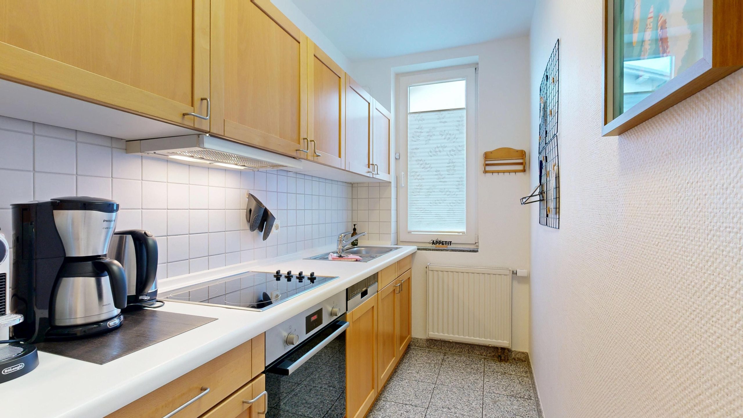 * Separate Küche mit moderner Küchenzeile, mit E-Herd, Backofen, Spülmaschine, Kühlschrank mit kleinem Gefrierfach, Mikrowelle, Wasserkocher, Kaffeemaschine, Toaster