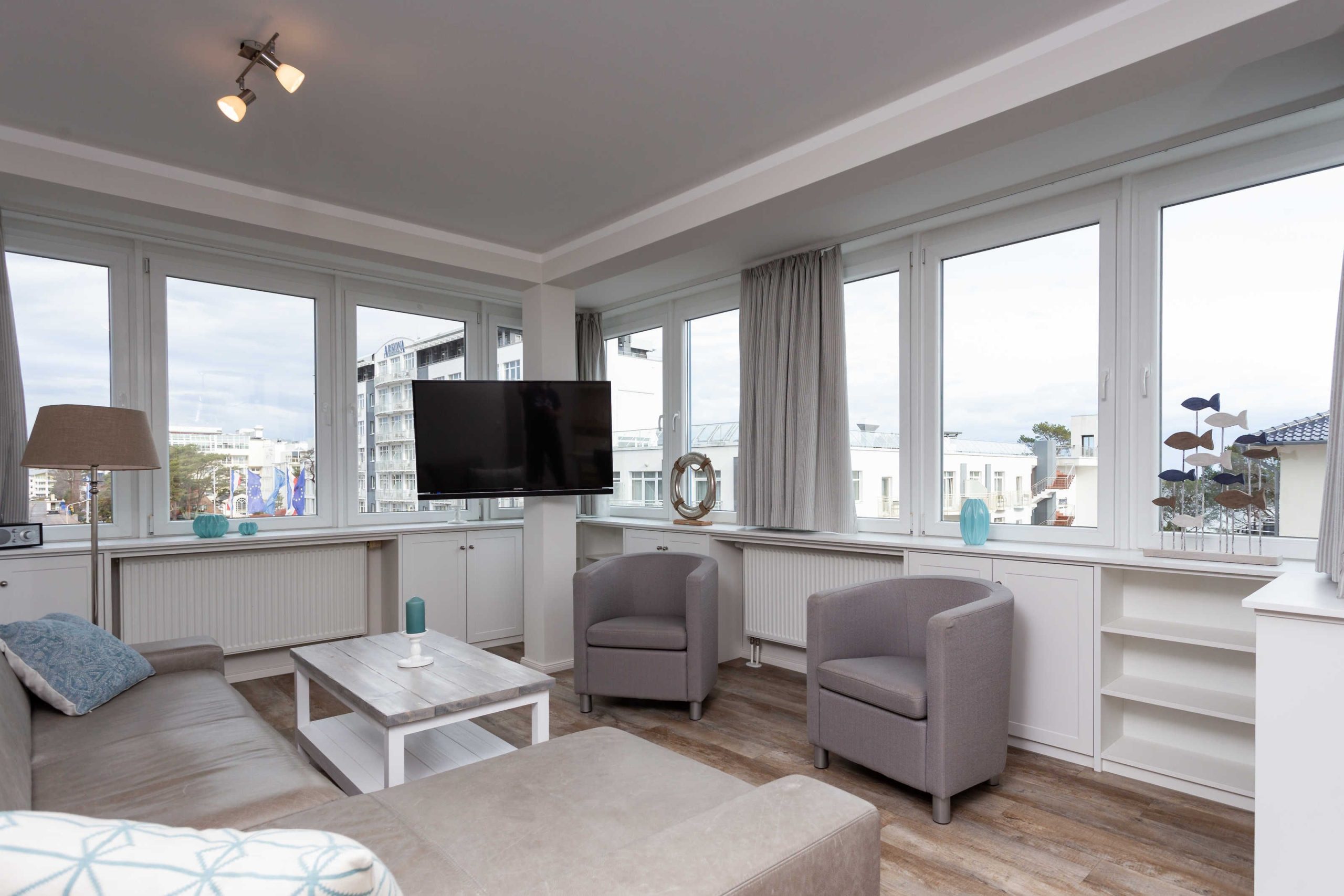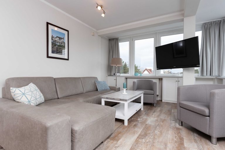 Moderne Ferienwohnung in Strandnähe mit Sauna, Fitnessraum und Fahrstuhl im HausFerienwohnung mit Ostseeblick für 4-6 Personen mit hochwertiger Möblierung im 2. OG mit 2 Schlafzimmern (3 Zimmer / 72 m²):