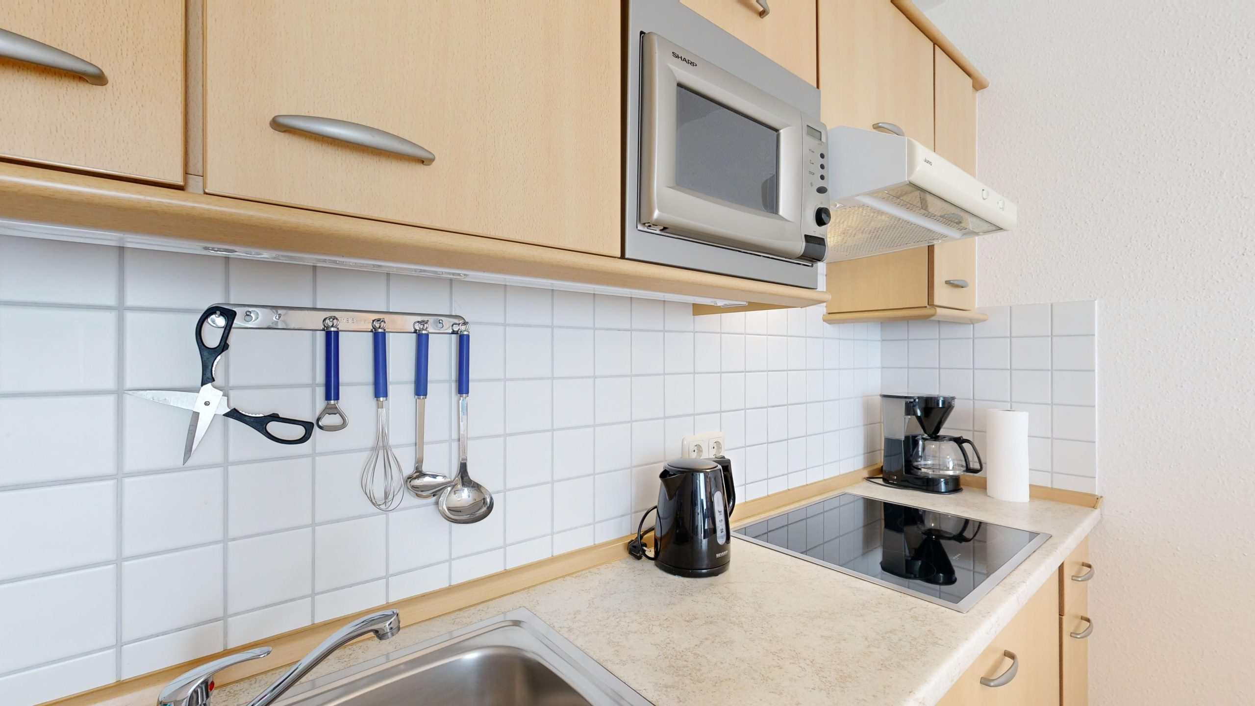 * Küchenzeile mit Spülmaschine, Ceranfeld, Mikrowelle, Kaffeemaschine, Toaster und Kühlschrank mit Gefrierfach