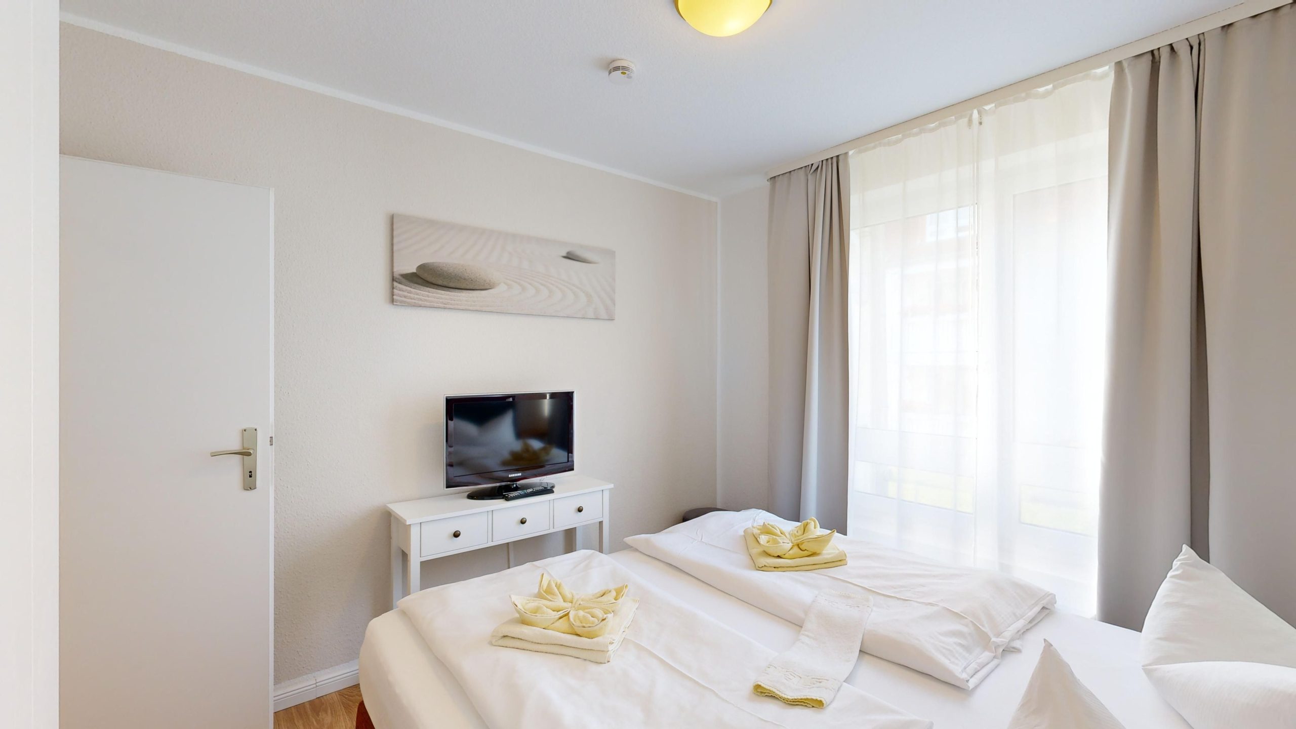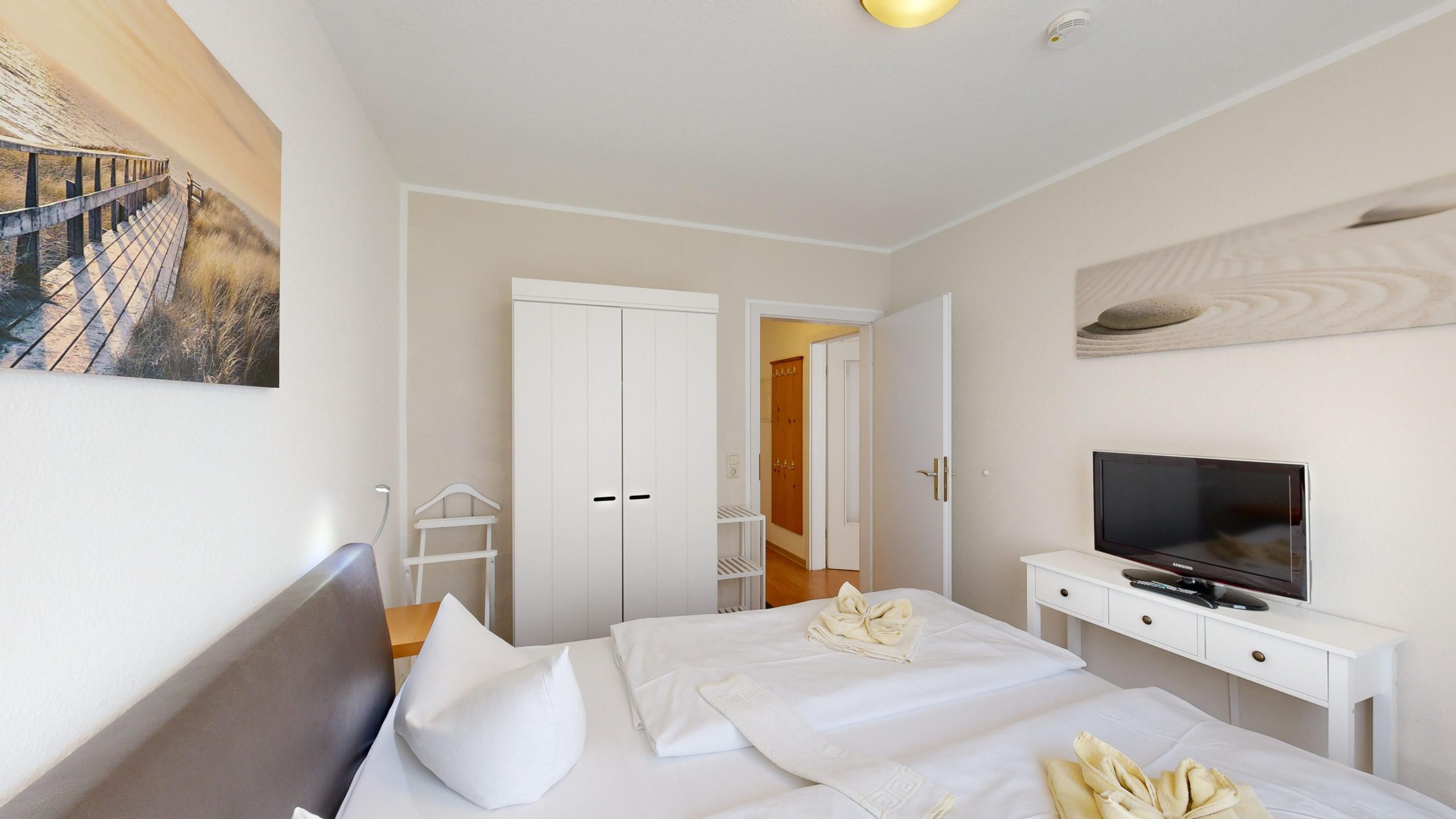 * 1 Schlafzimmer mit einem Boxspringbett (Doppelbett) und TV