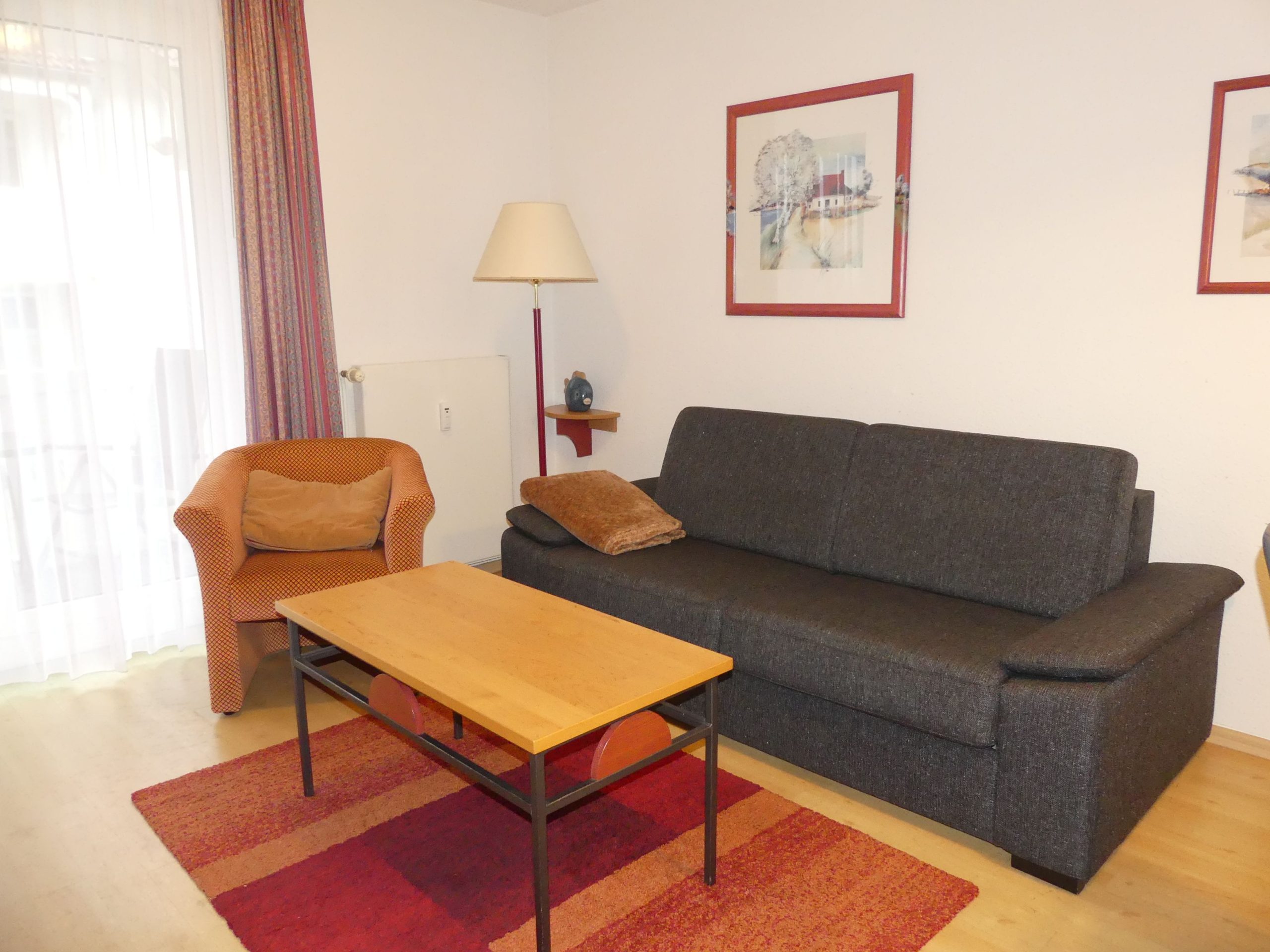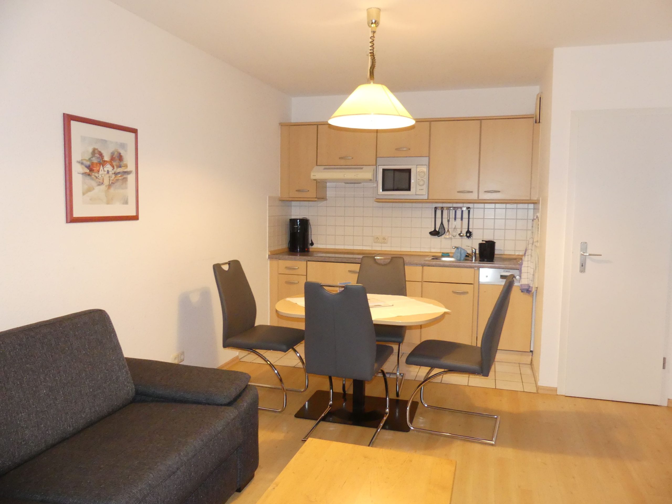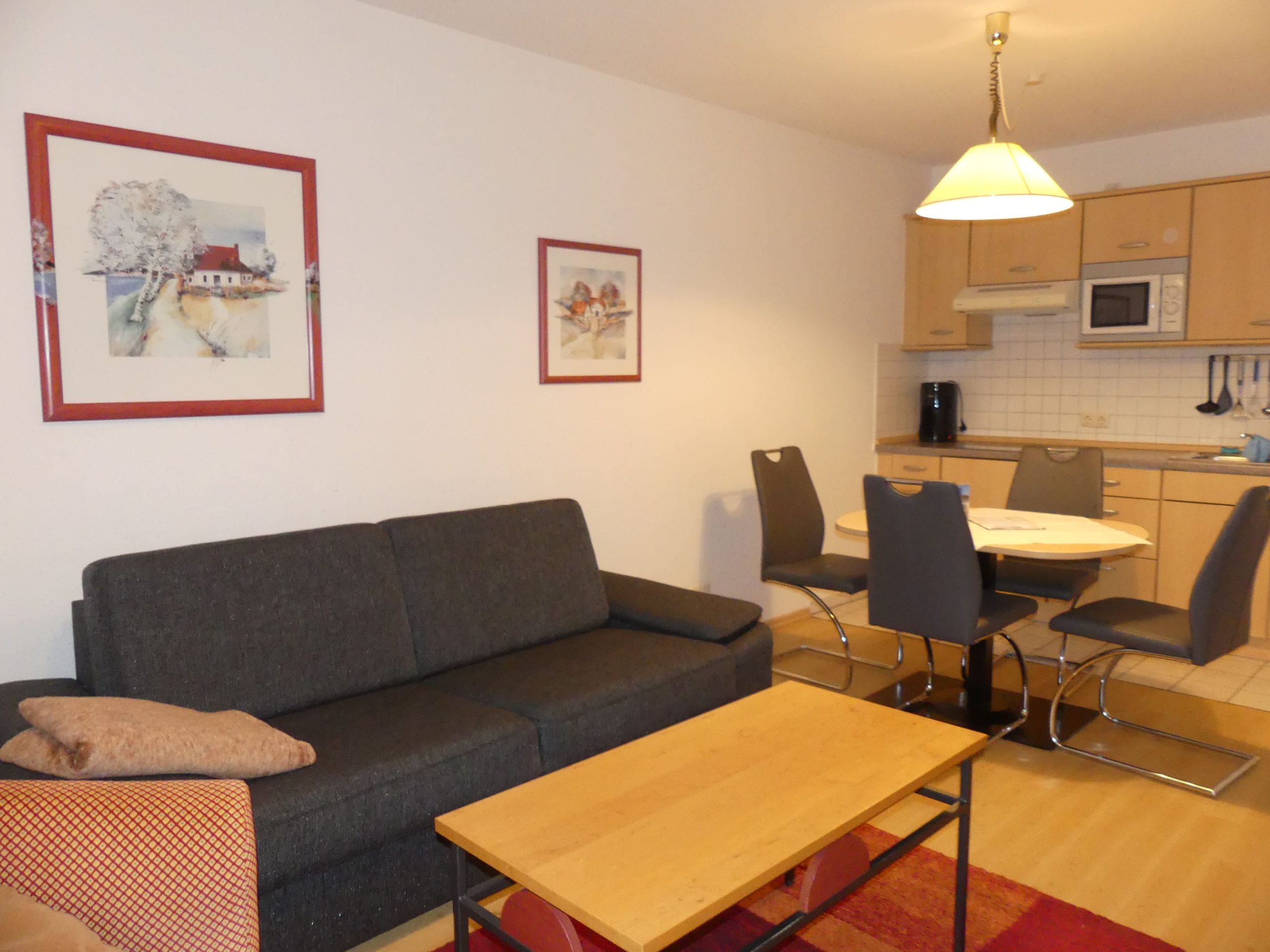 * Wohnzimmer: Couchgarnitur (Schlafgelegenheit für 2 Personen), Kabel-TV, Stereoanlage, Internetanschluss (WLAN), Esstisch