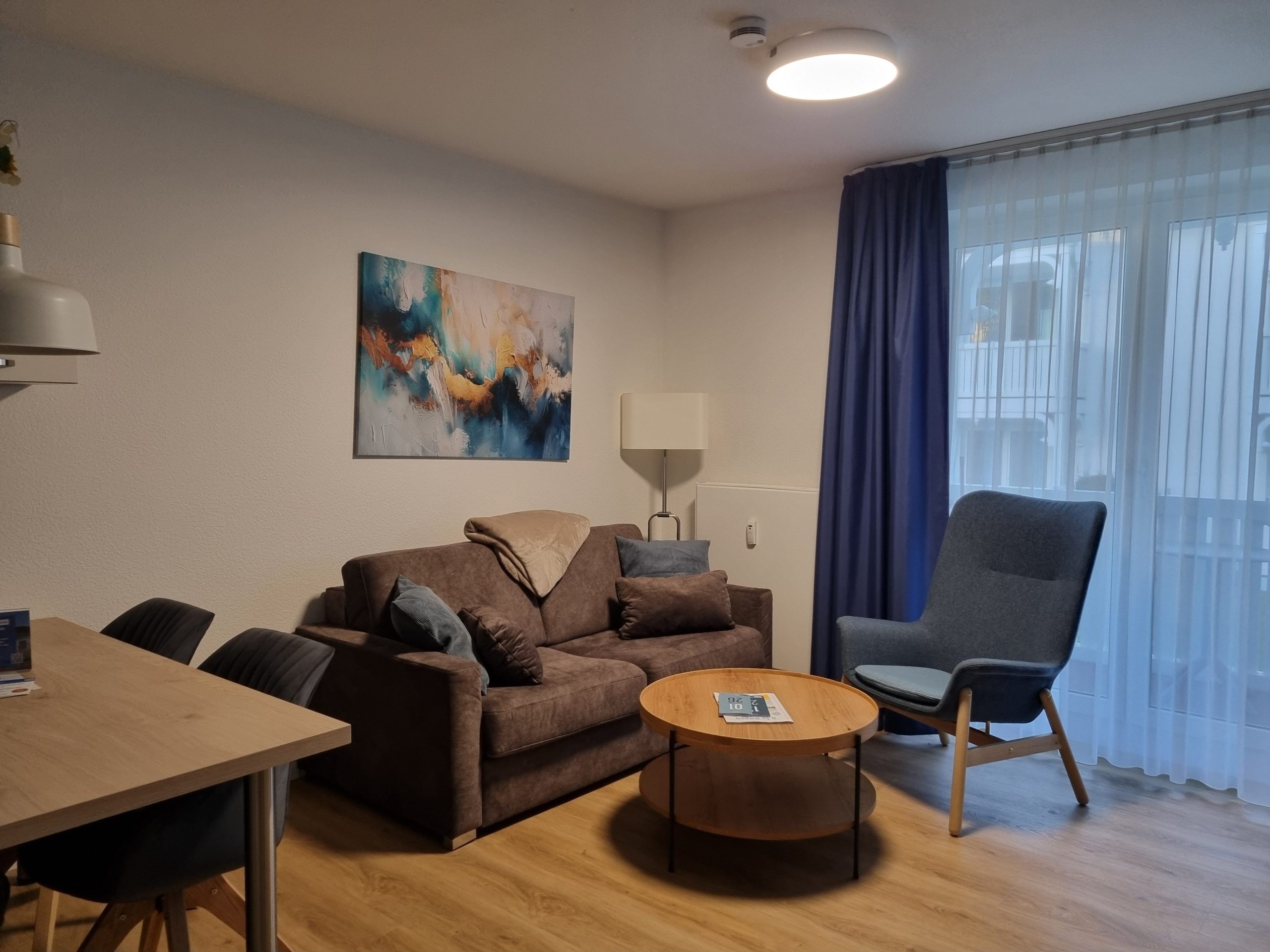 * Wohnzimmer: Couchgarnitur (Schlafgelegenheit für 2 Personen), Kabel-TV, Stereoanlage, Internetanschluss (WLAN), Esstisch