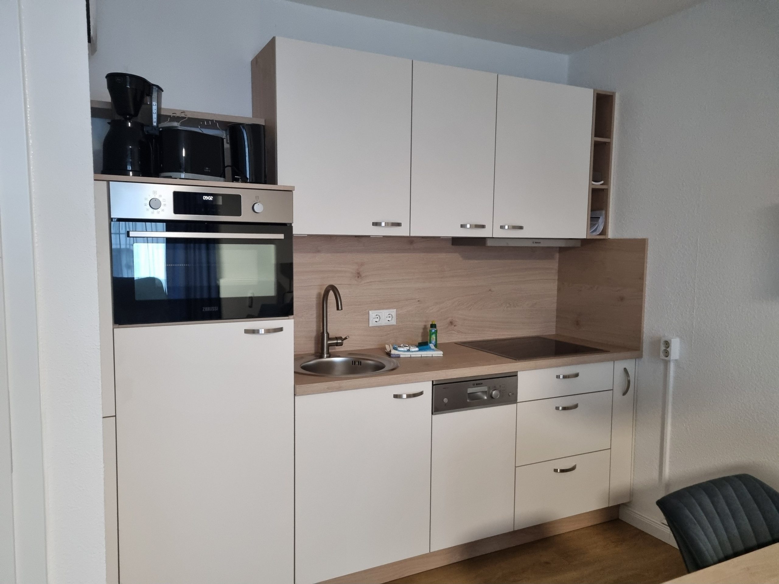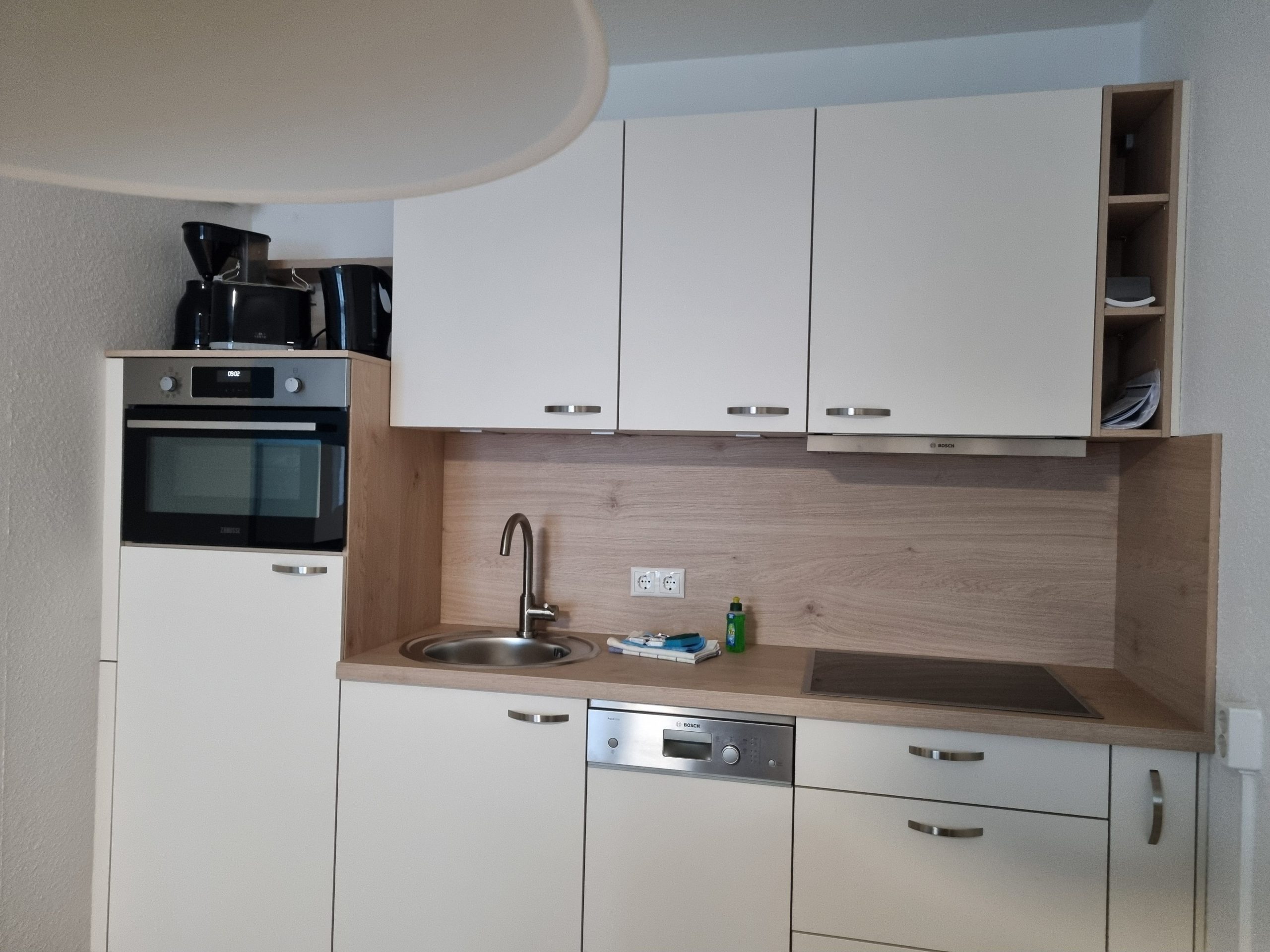 * neue Küchenzeile mit Spülmaschine, Backofen/Mikrowelle-Kombigerät, Ceranfeld, Kaffeemaschine, Toaster und Kühlschrank mit Gefrierfach