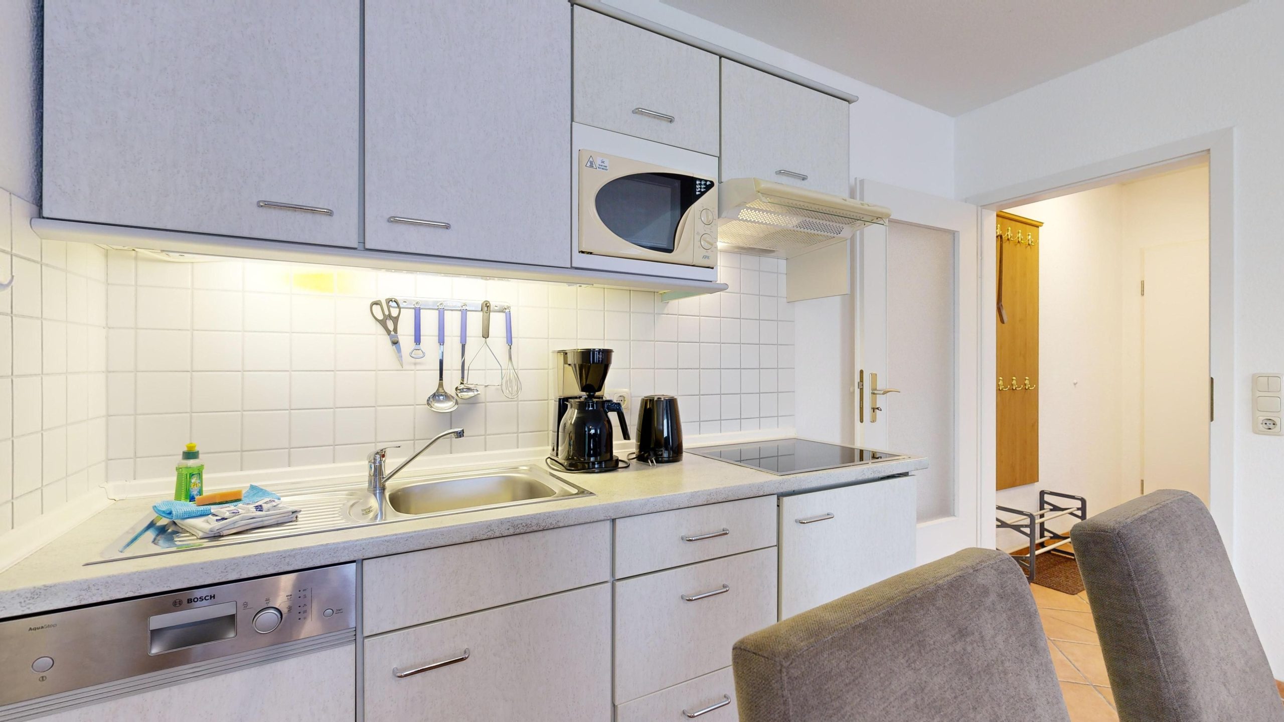 * Küchenzeile mit Spülmaschine, Ceranfeld, Mikrowelle, Kaffeemaschine, Toaster und Kühlschrank mit Gefrierfach
