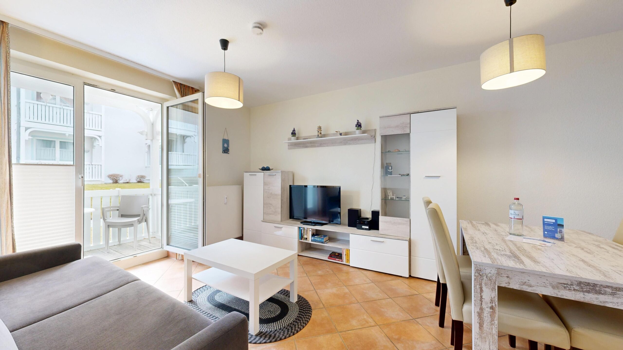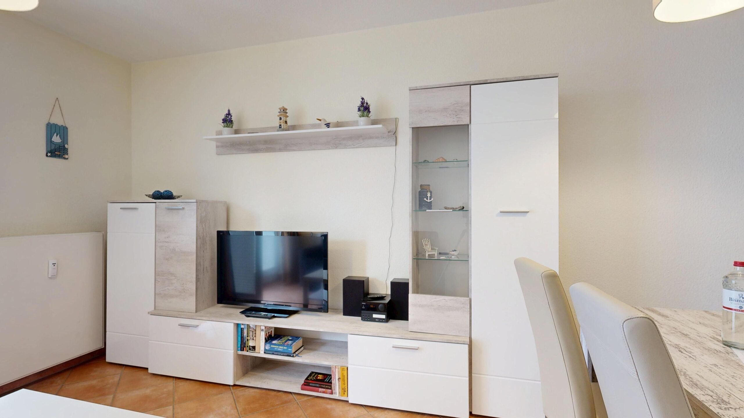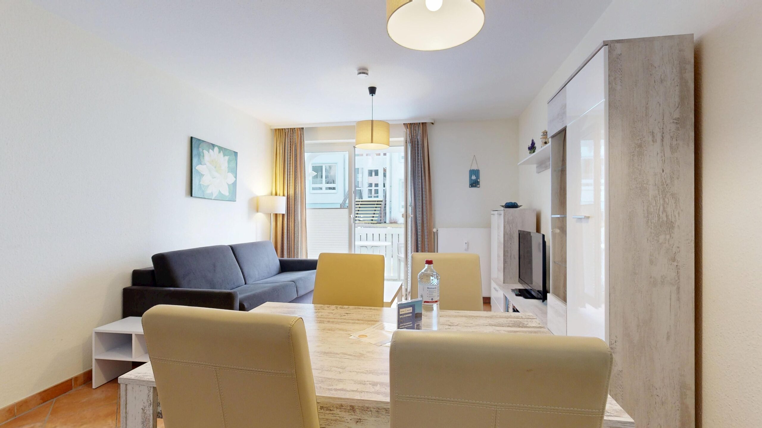 * Wohnzimmer: Couchgarnitur (Schlafgelegenheit für 2 Personen), Kabel-TV, Stereoanlage, Internetanschluss (WLAN), Esstisch