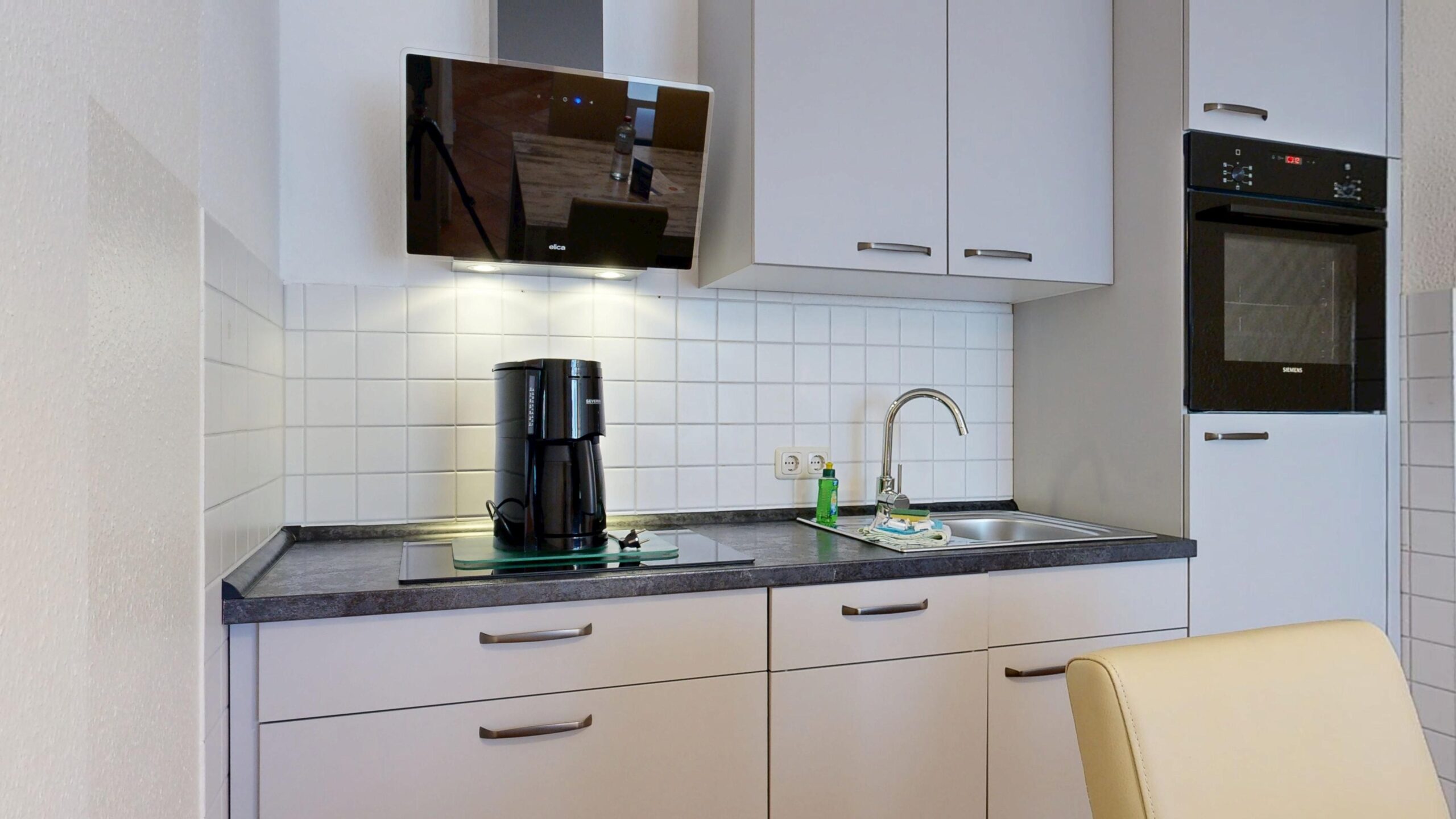 * Küchenzeile mit Spülmaschine, Ceranfelder, Mikrowelle, Kaffeemaschine, Toaster und Kühlschrank mit Gefrierfach
