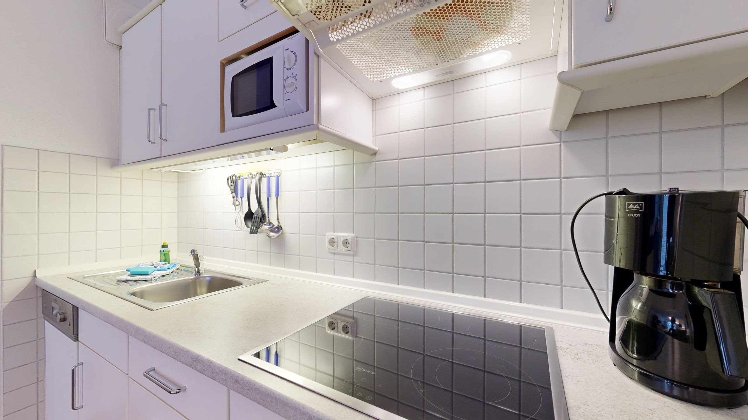 * Küchenzeile mit Spülmaschine, Ceranfeld, Mikrowelle, Kaffeemaschine, Toaster und Kühlschrank mit Gefrierfach
