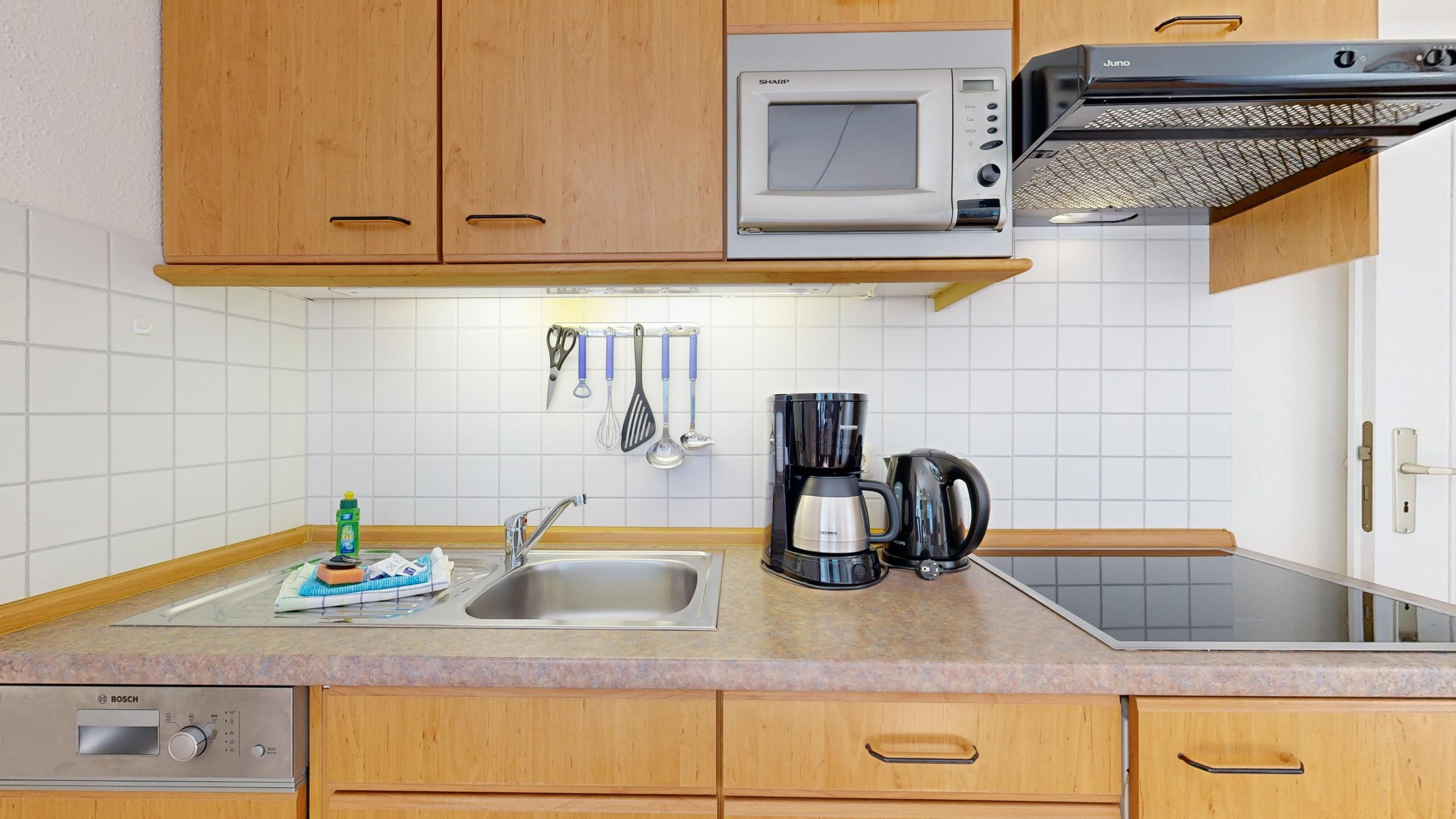 * Küchenzeile mit Spülmaschine, Ceranfeld, Mikrowelle, Kaffeemaschine, Toaster und Kühlschrank mit Gefrierfach