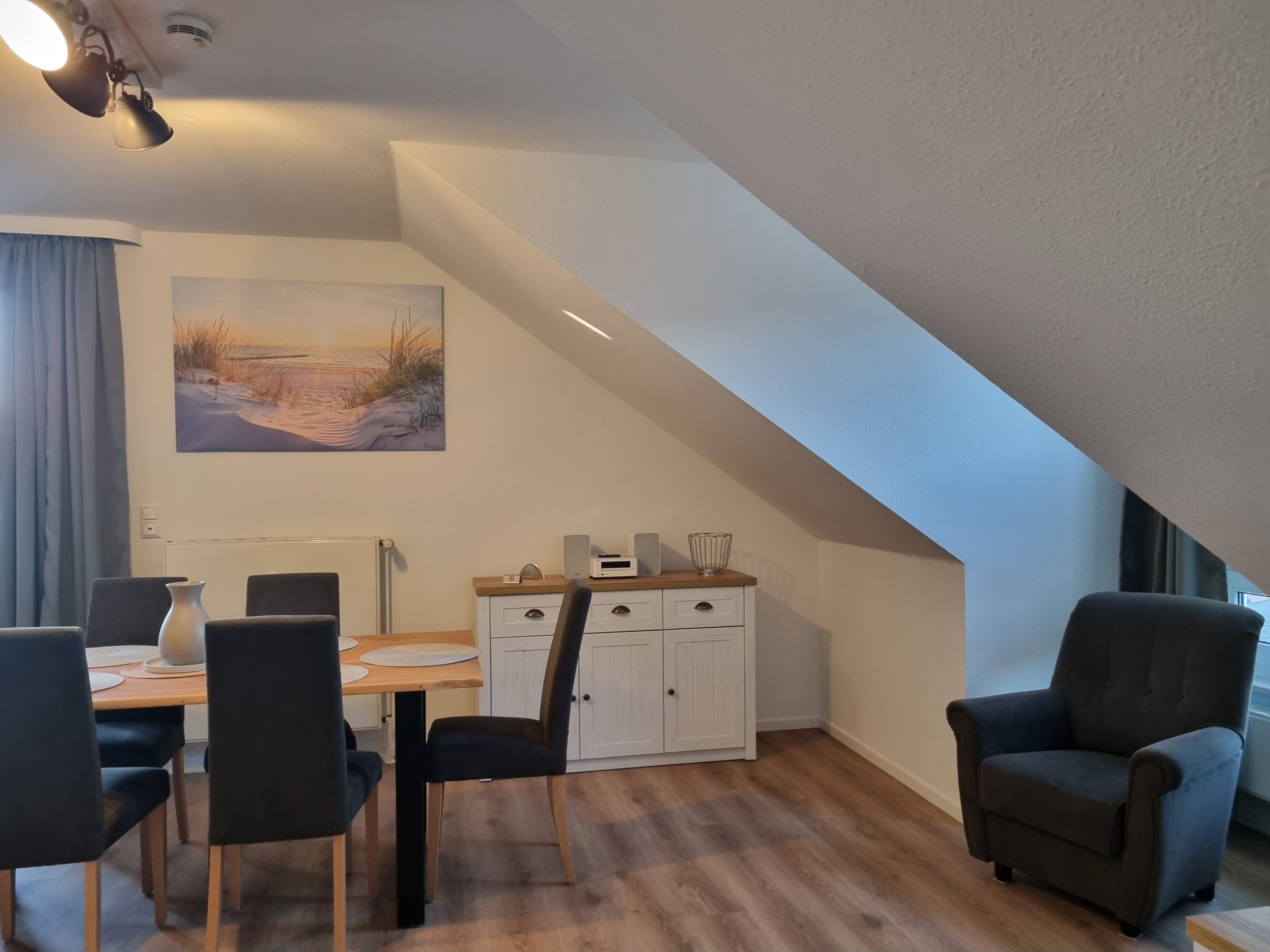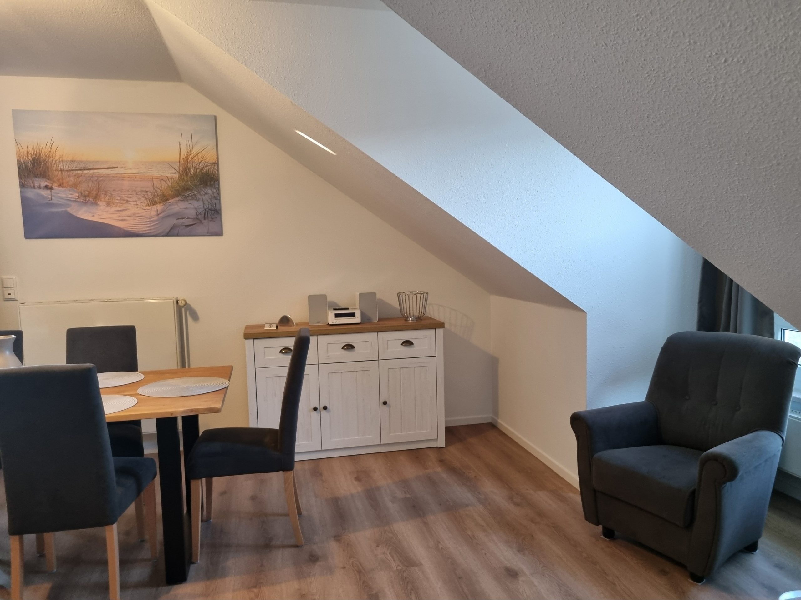 * Wohnzimmer: Couchgarnitur (Schlafgelegenheit für 2 Personen), Kabel-TV, Stereoanlage, Internetanschluss (WLAN), Esstisch