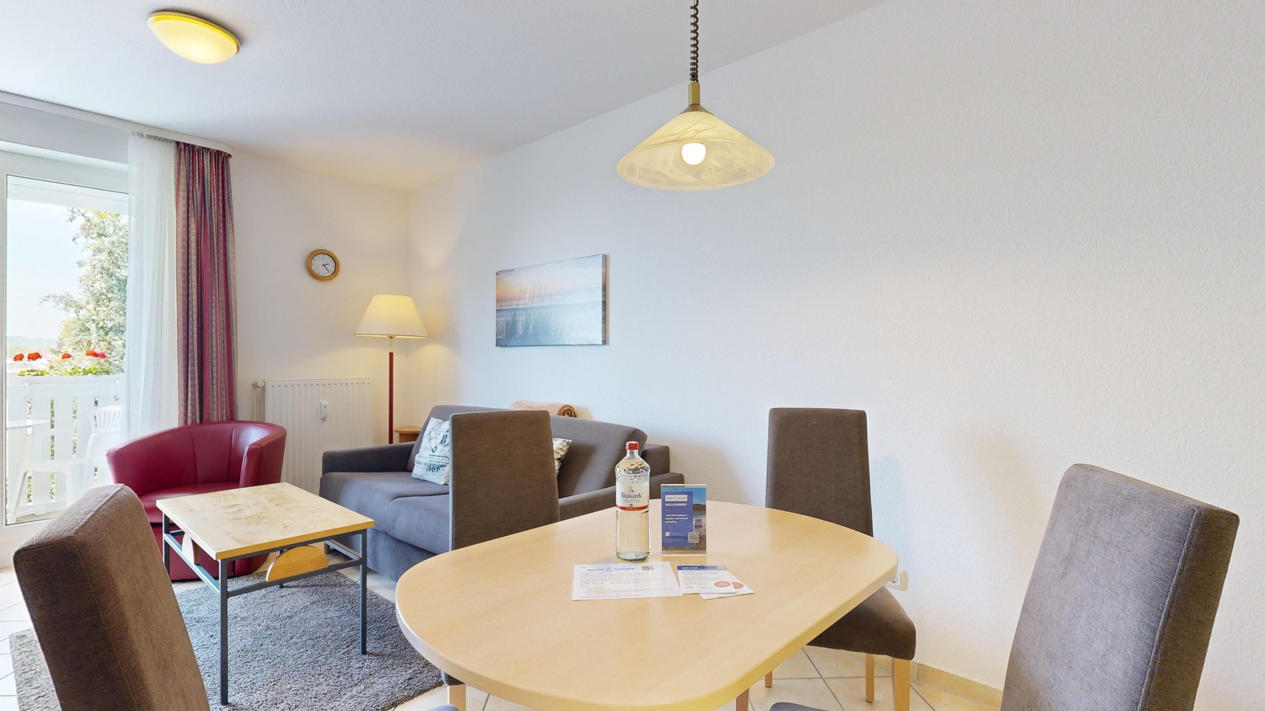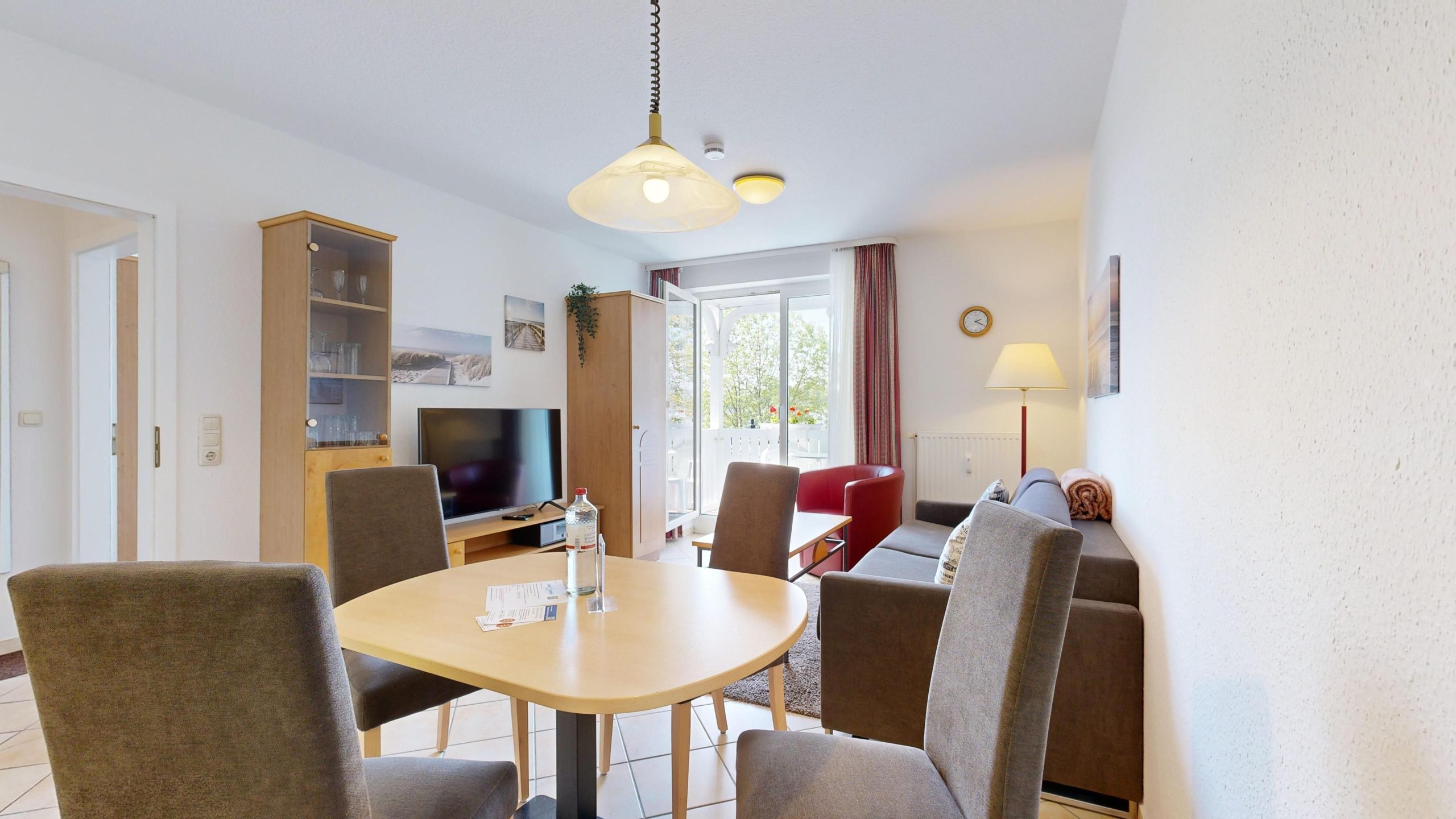 * Wohnzimmer: Couchgarnitur (Schlafgelegenheit für 2 Personen), Kabel-TV, Stereoanlage, Internetanschluss (WLAN), Esstisch
