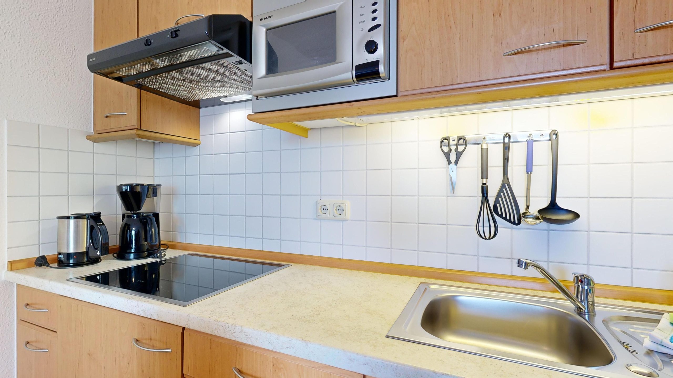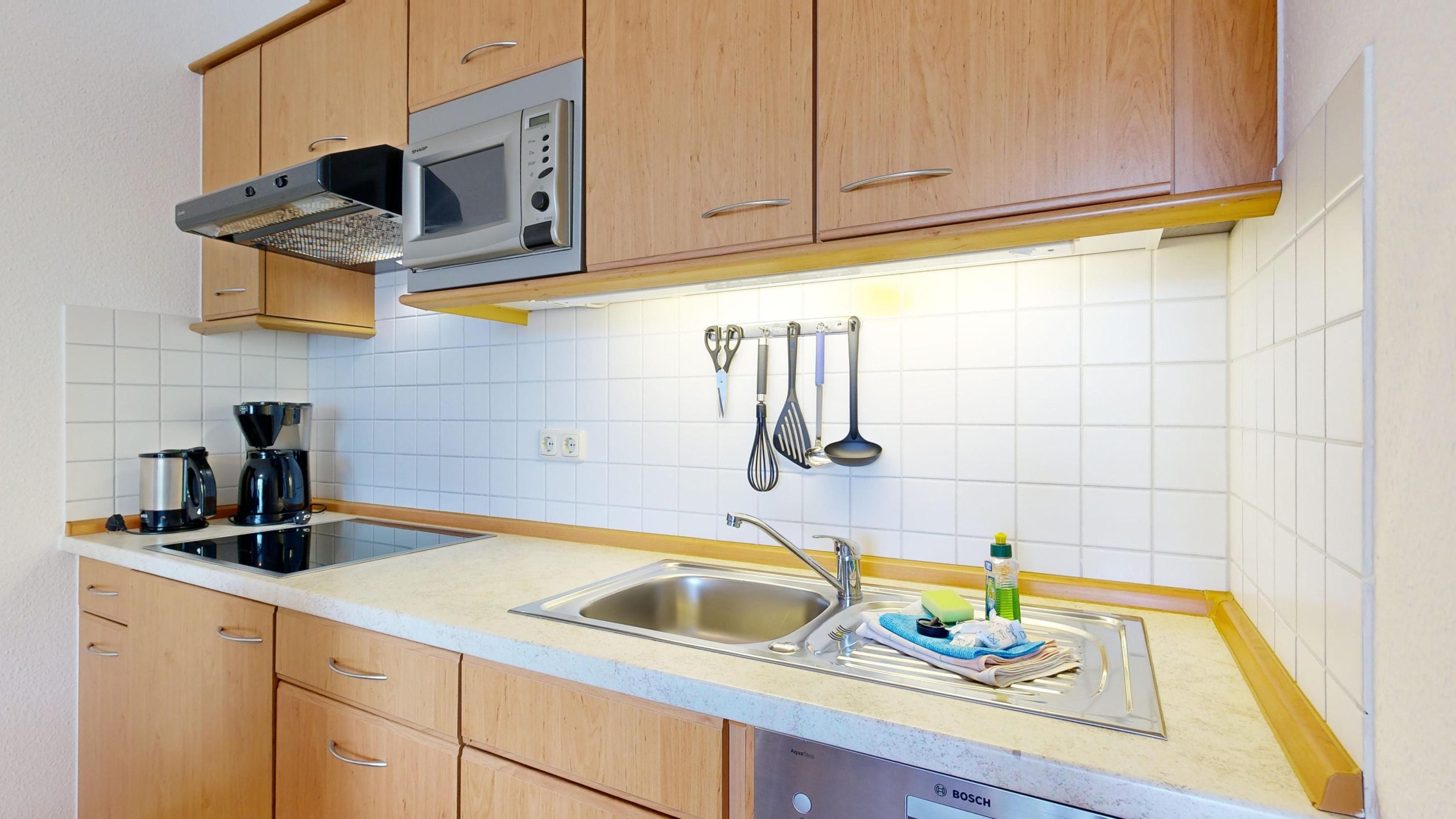 * Küchenzeile mit Spülmaschine, Ceranfeld, Mikrowelle, Kaffeemaschine, Toaster und Kühlschrank mit Gefrierfach