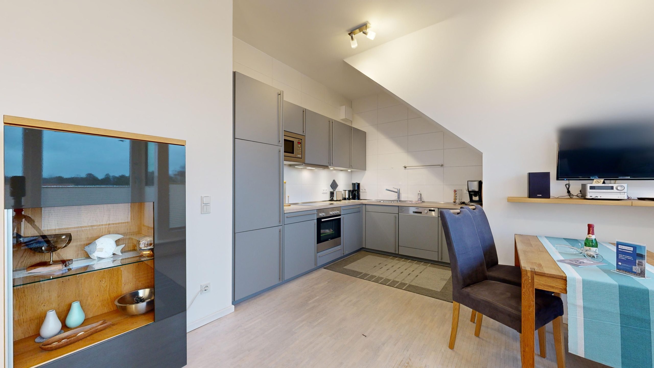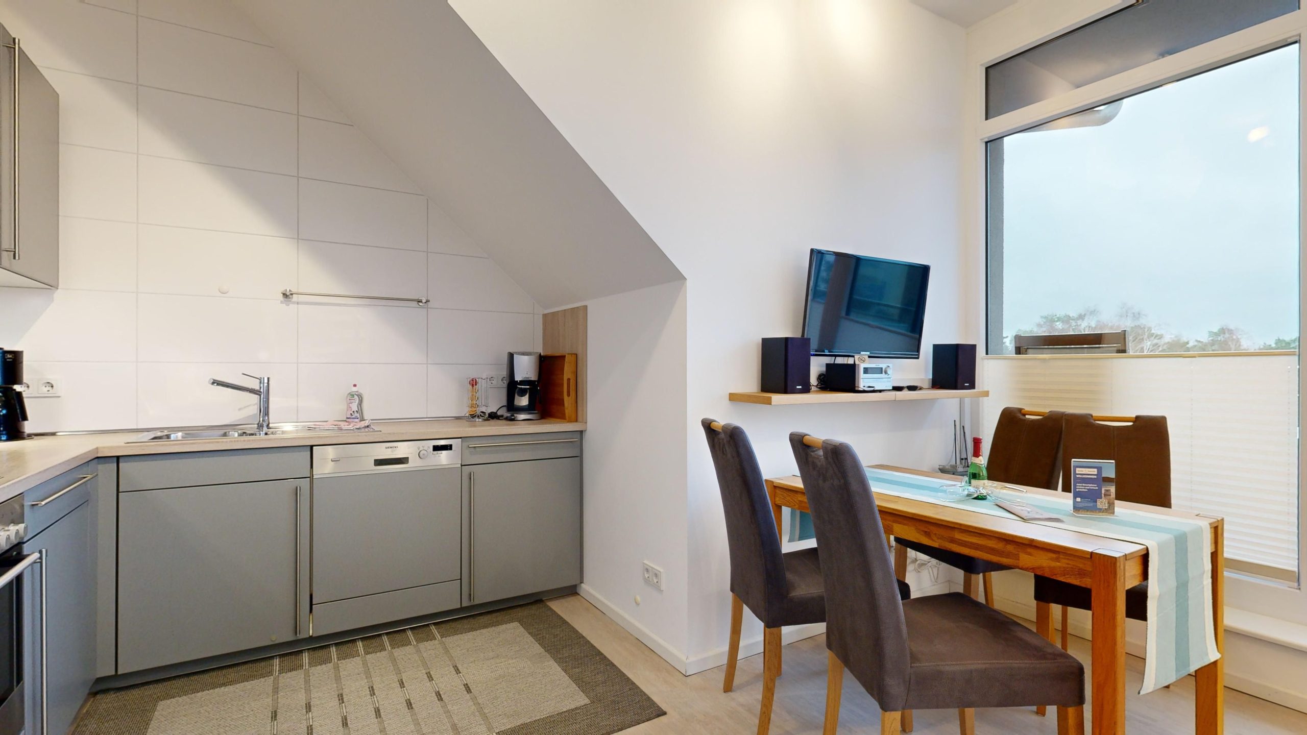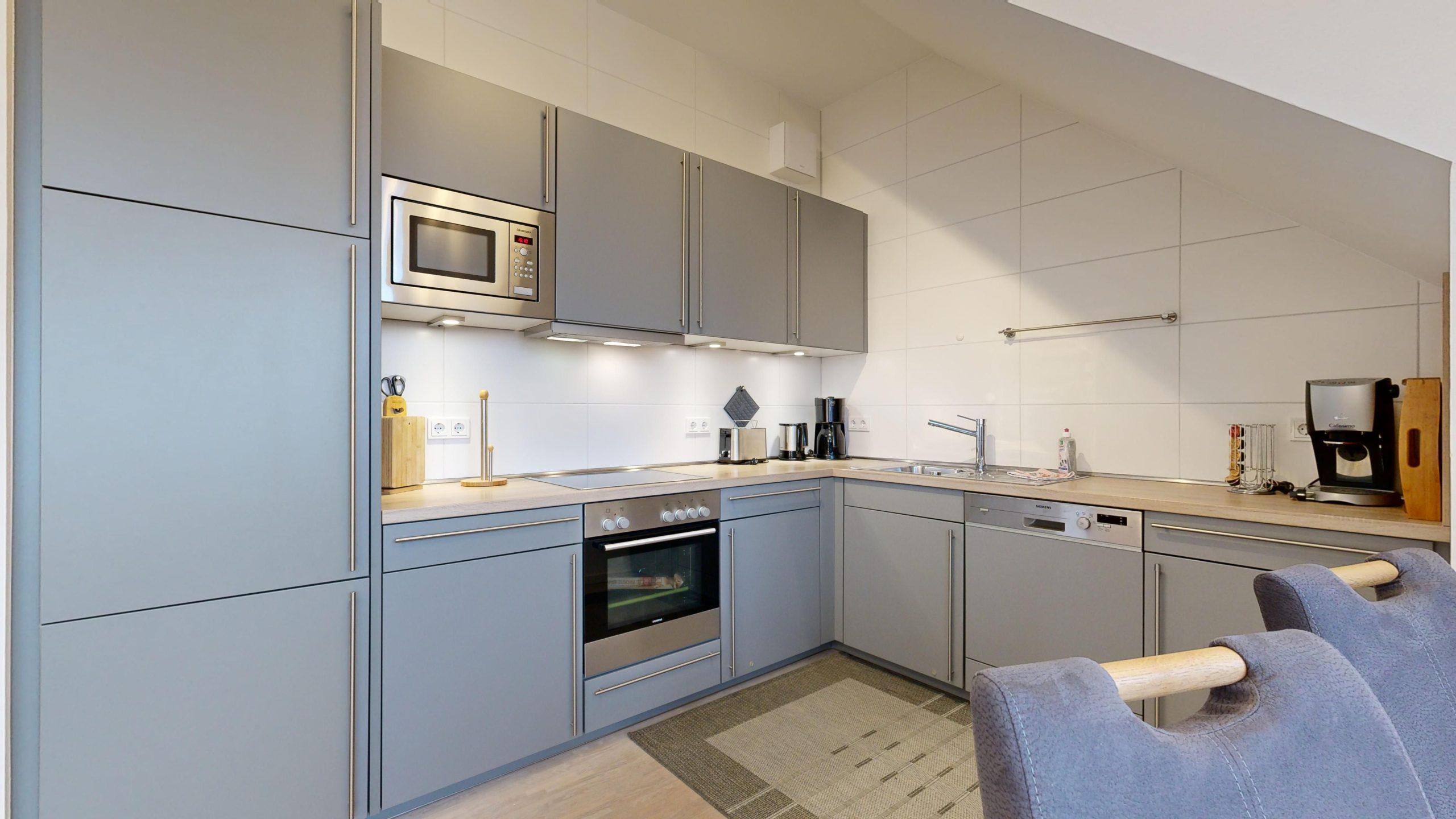 * Küche: Moderne Küchenzeile mit Ceran-Herd, Backofen, Spülmaschine, Mikrowelle, Wasserkocher, Toaster, Kaffeemaschine, Kaffee-Kapselmaschine (Tchibo Cafissimo)