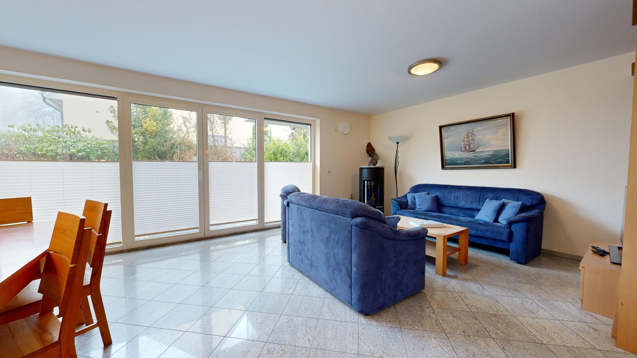 * Wohnzimmer (32 m²): Gemütliche Couchgarnitur, SAT-TV, WLAN-Internetanschluss, DVD-Player und Esstisch für 6 Personen, große Fensterfront zur südlich ausgerichteten Terrasse