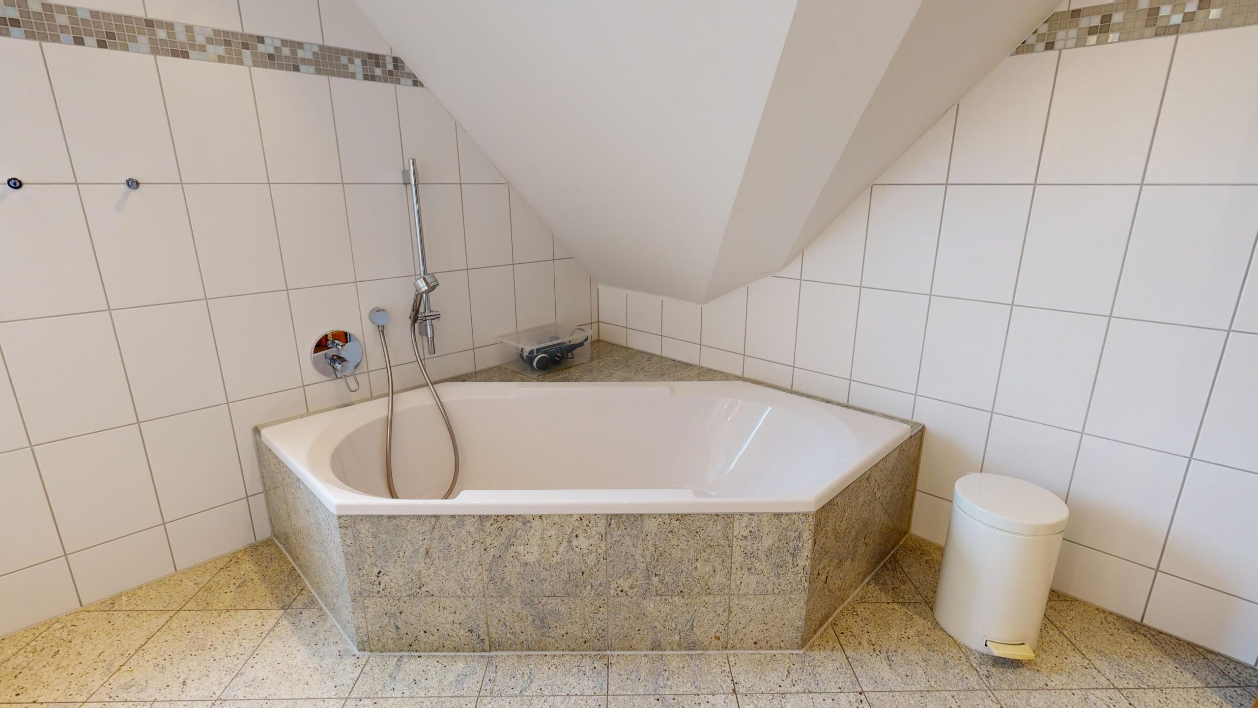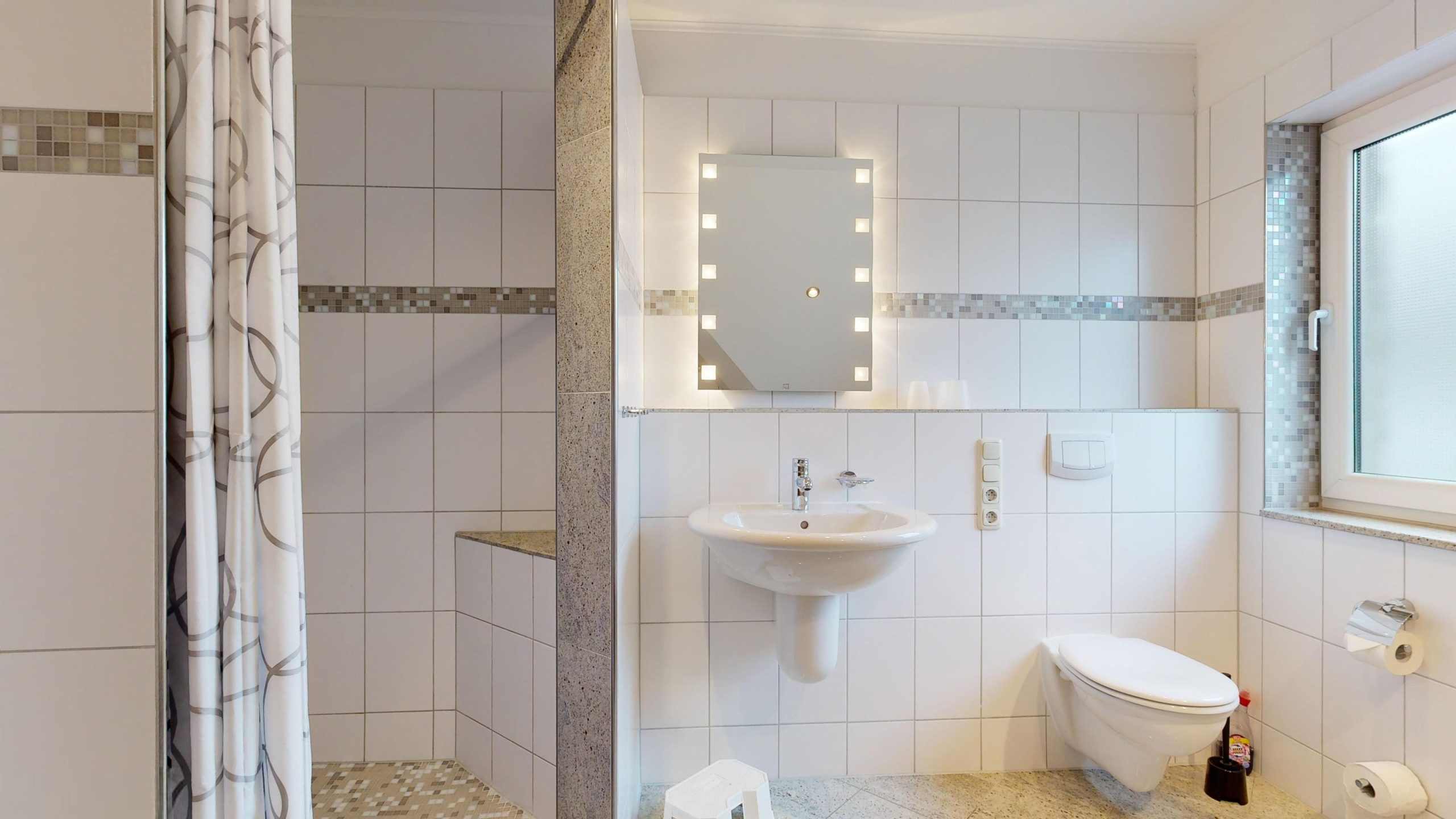 * 1 Badezimmer mit Badewanne, großzügige Dusche mit ebenerdigen Eintritt, WC und Föhn