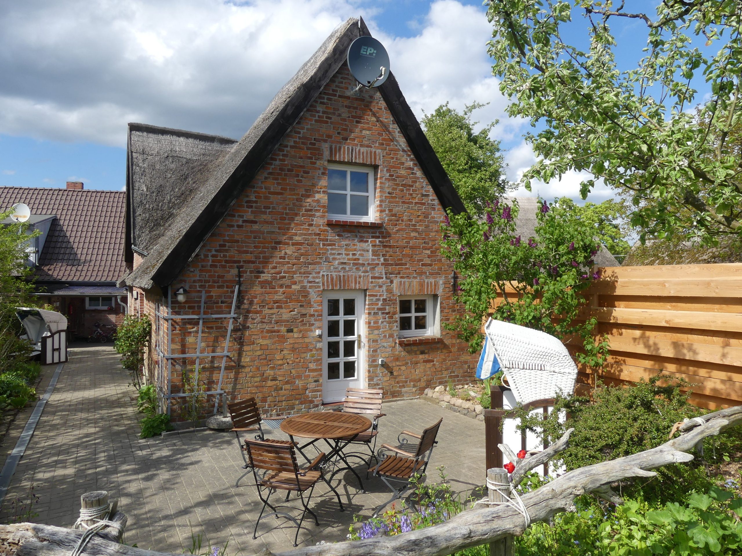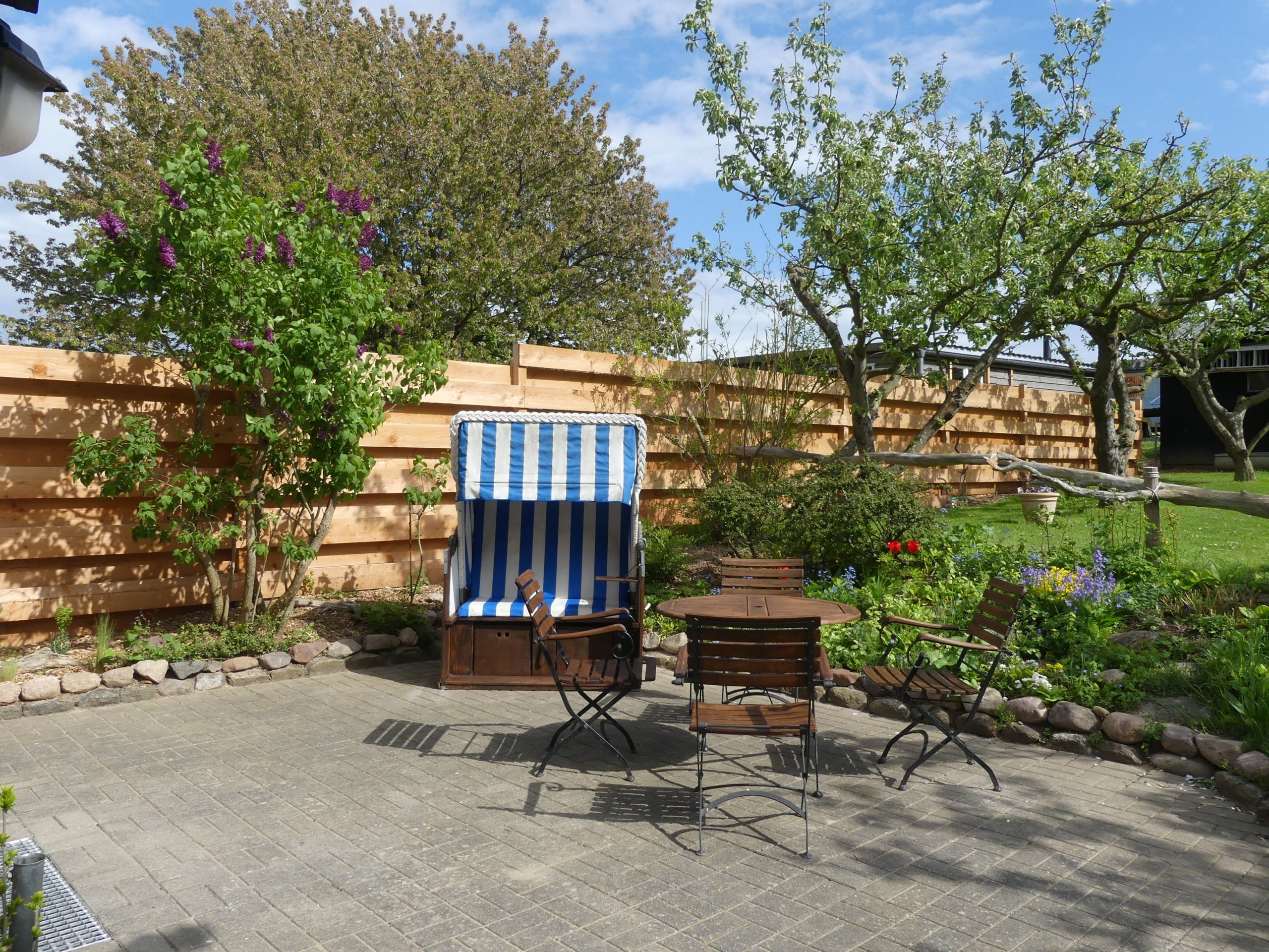 * Terrasse zum Süd-Osten mit Gartenmöbeln und Strandkorb