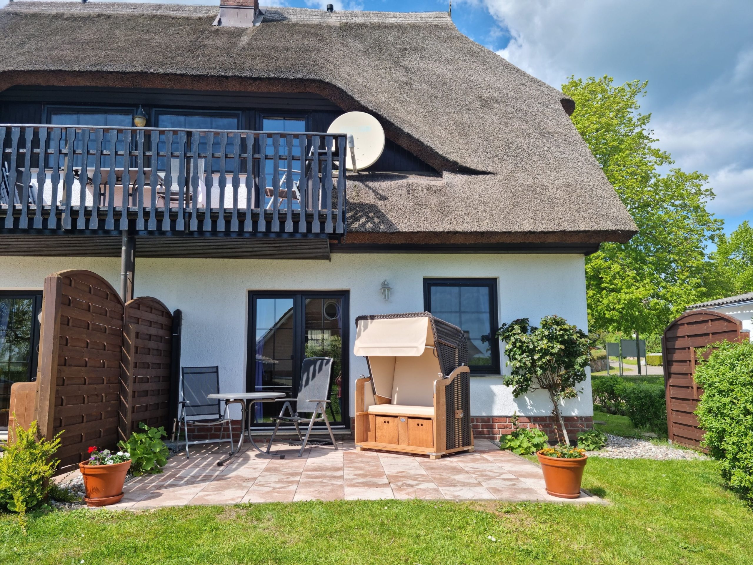 * Terrasse mit Strandkorb und Gartenmöbeln