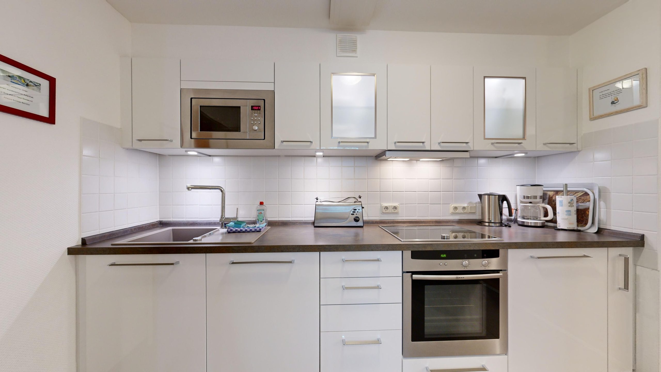 * Küche: Moderne Küchenzeile, Induktionsherd, Spülmaschine, Backofen, Mikrowelle, Wasserkocher, Kaffeemaschine und Toaster