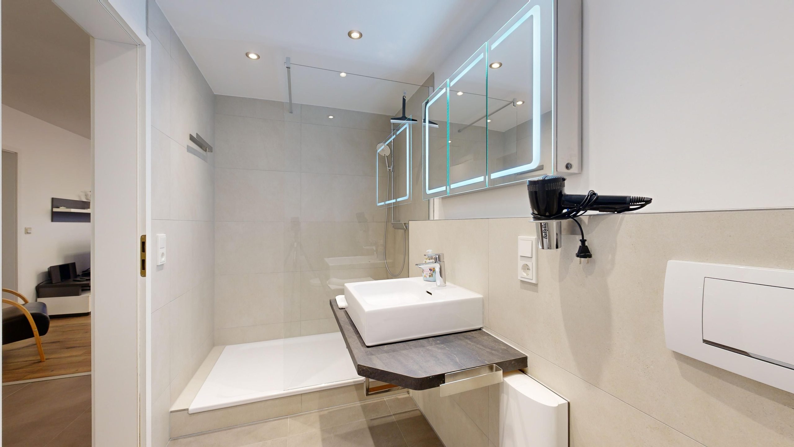 * 1 Badezimmer mit Dusche, WC und Föhn