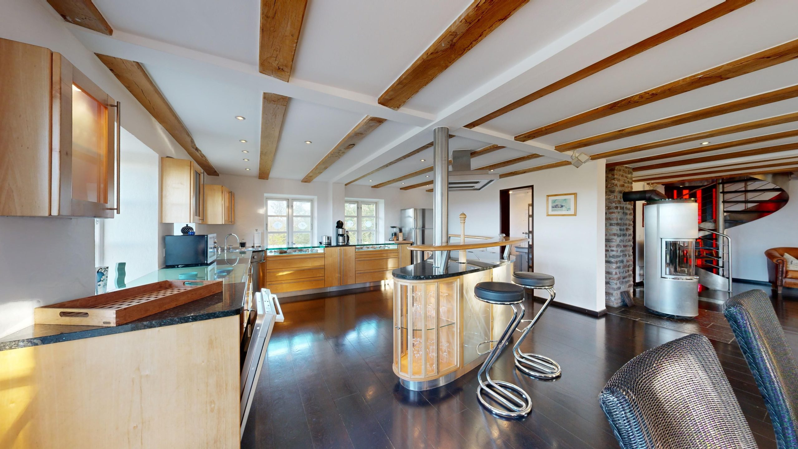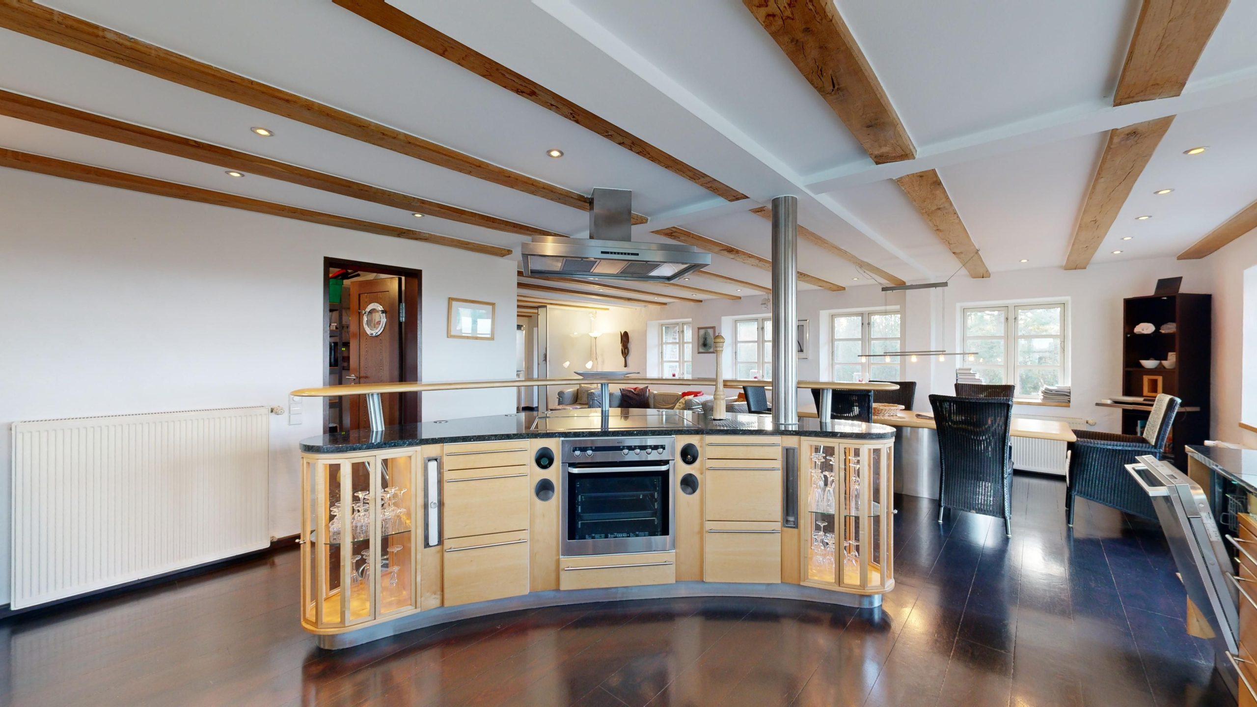 * Küche: Thekenartig (in Form eines Bummerangs) abgetrennter Küchenbereich mit modernster Ausstattung, wie Spülmaschine, Ceranfeld, Mikrowelle, Backofen,...