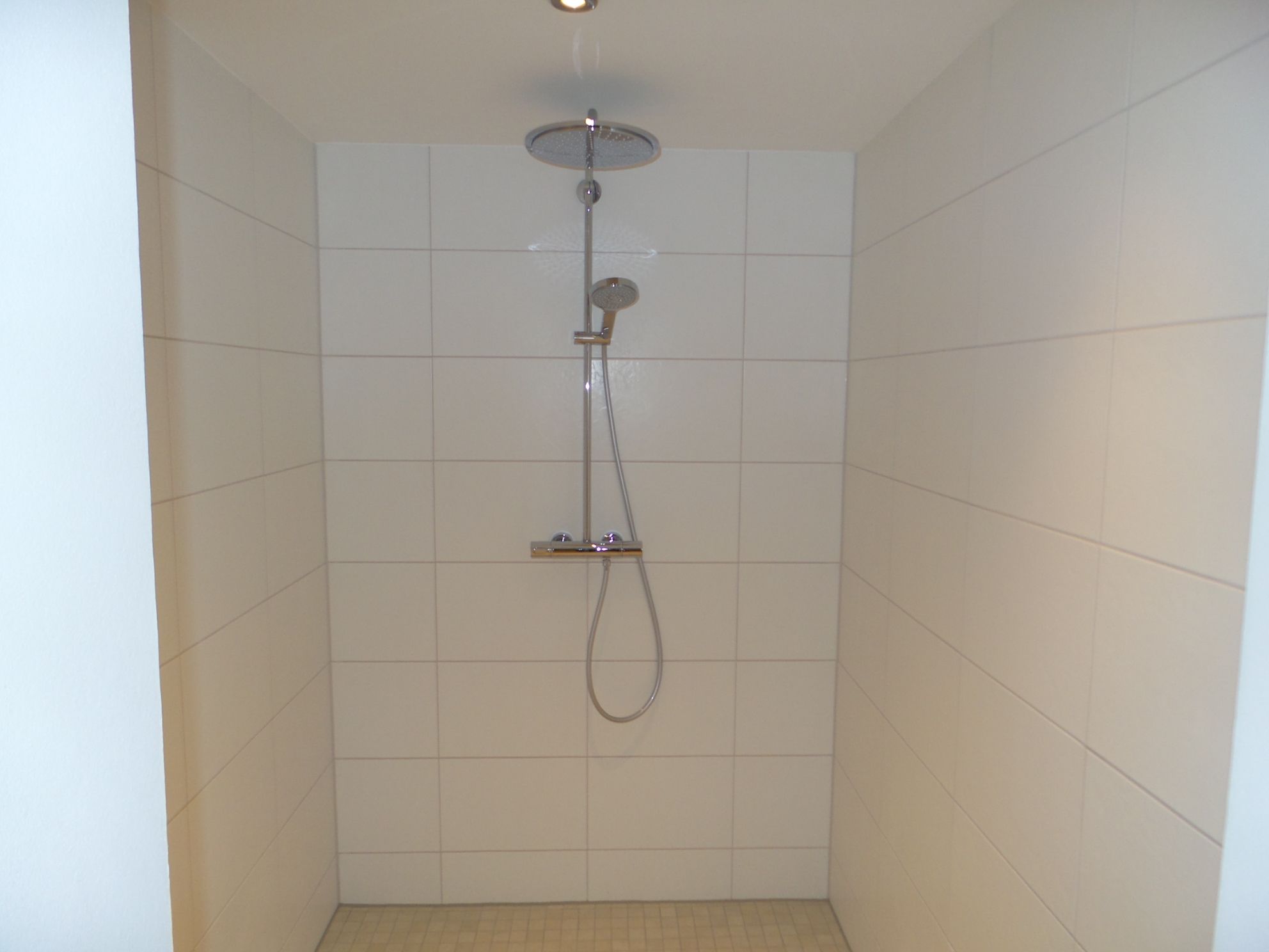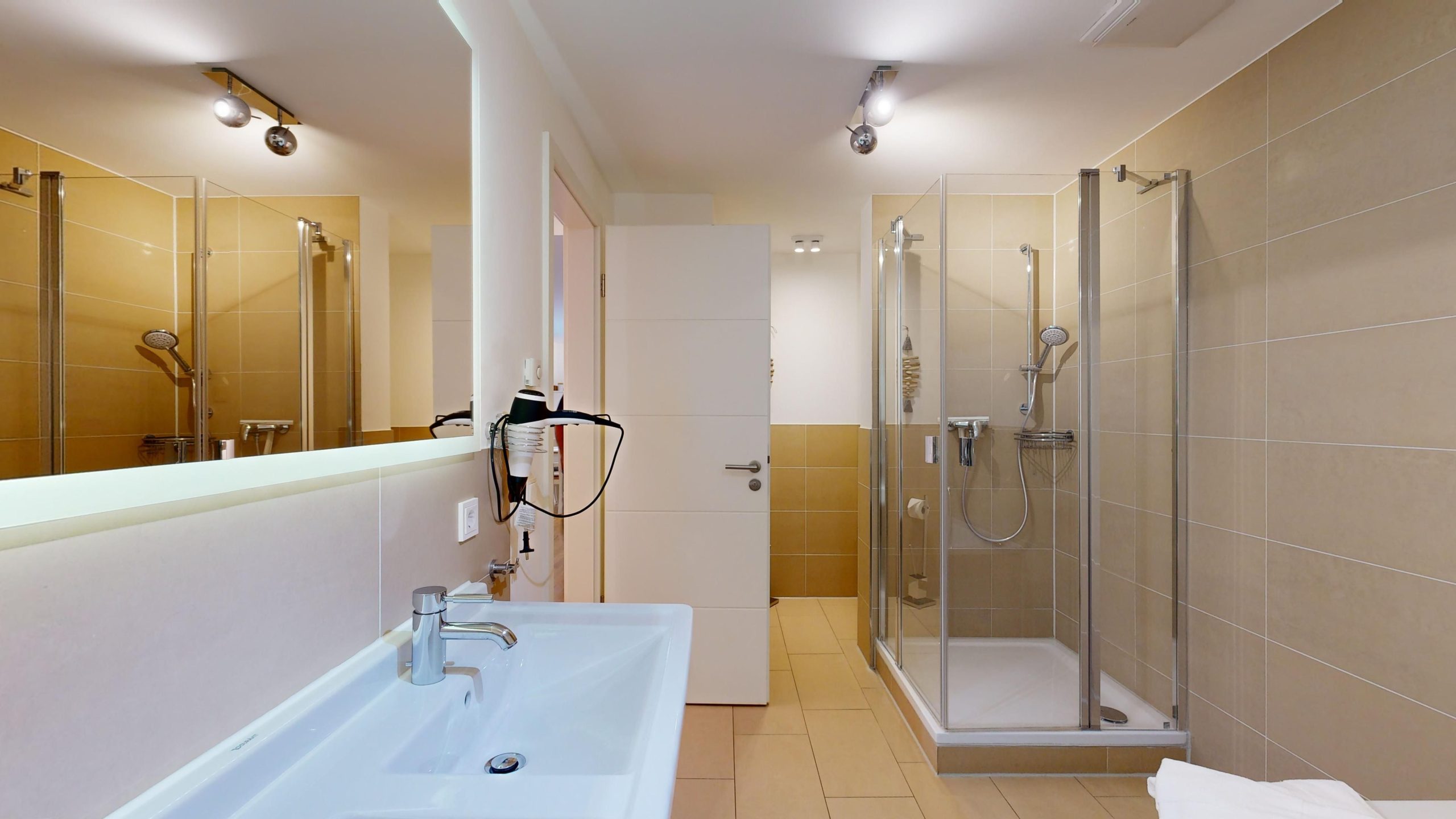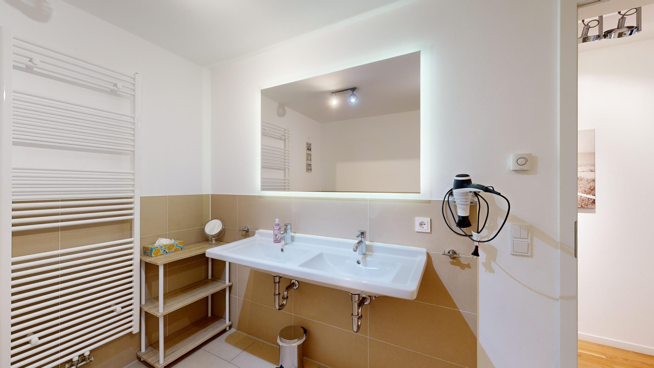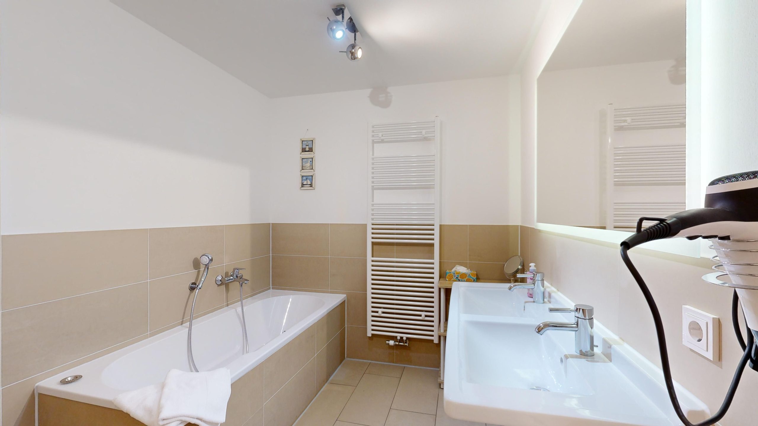 * Großes Badezimmer mit Dusche, Badewanne und Doppelwaschbecken, WC, Föhn, Waschmaschine