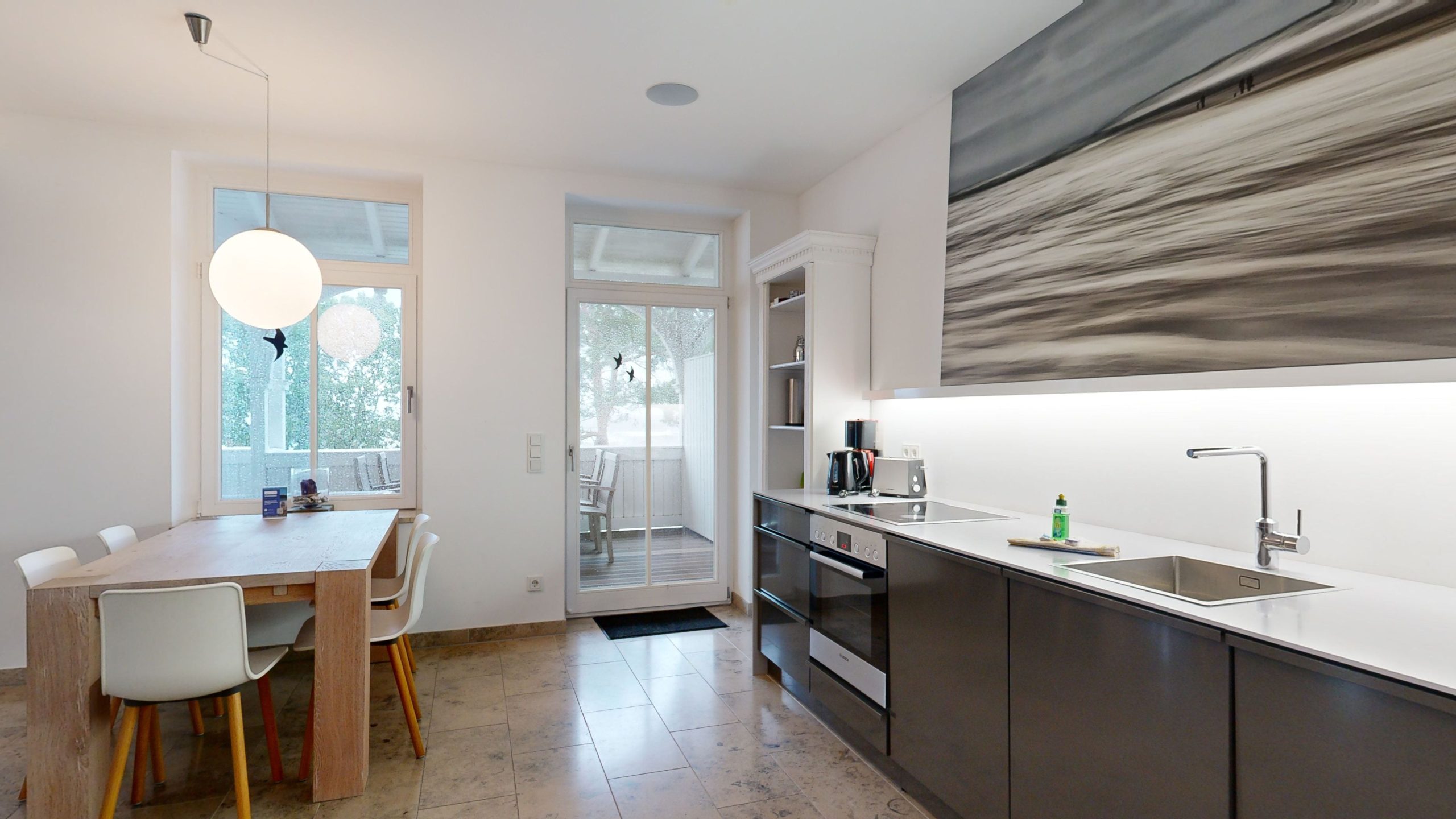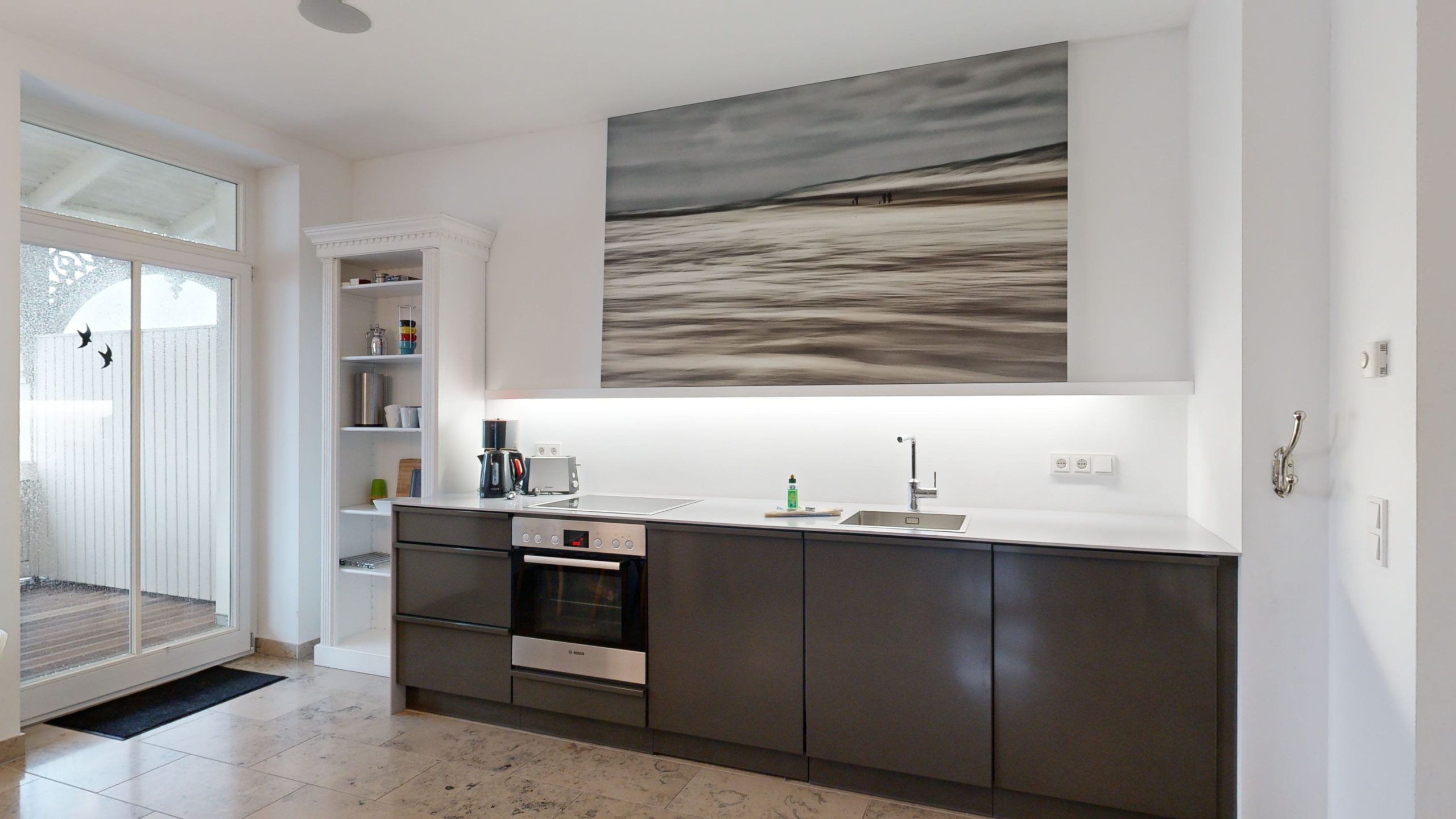 * Küche: Hochwertige, neue Küchenzeile im Wohnraum integriert mit Ceran-Herd und Backofen, Spülmaschine, Kühlschrank mit Gefrierfach, Kaffeemaschine, Toaster, Wasserkocher
