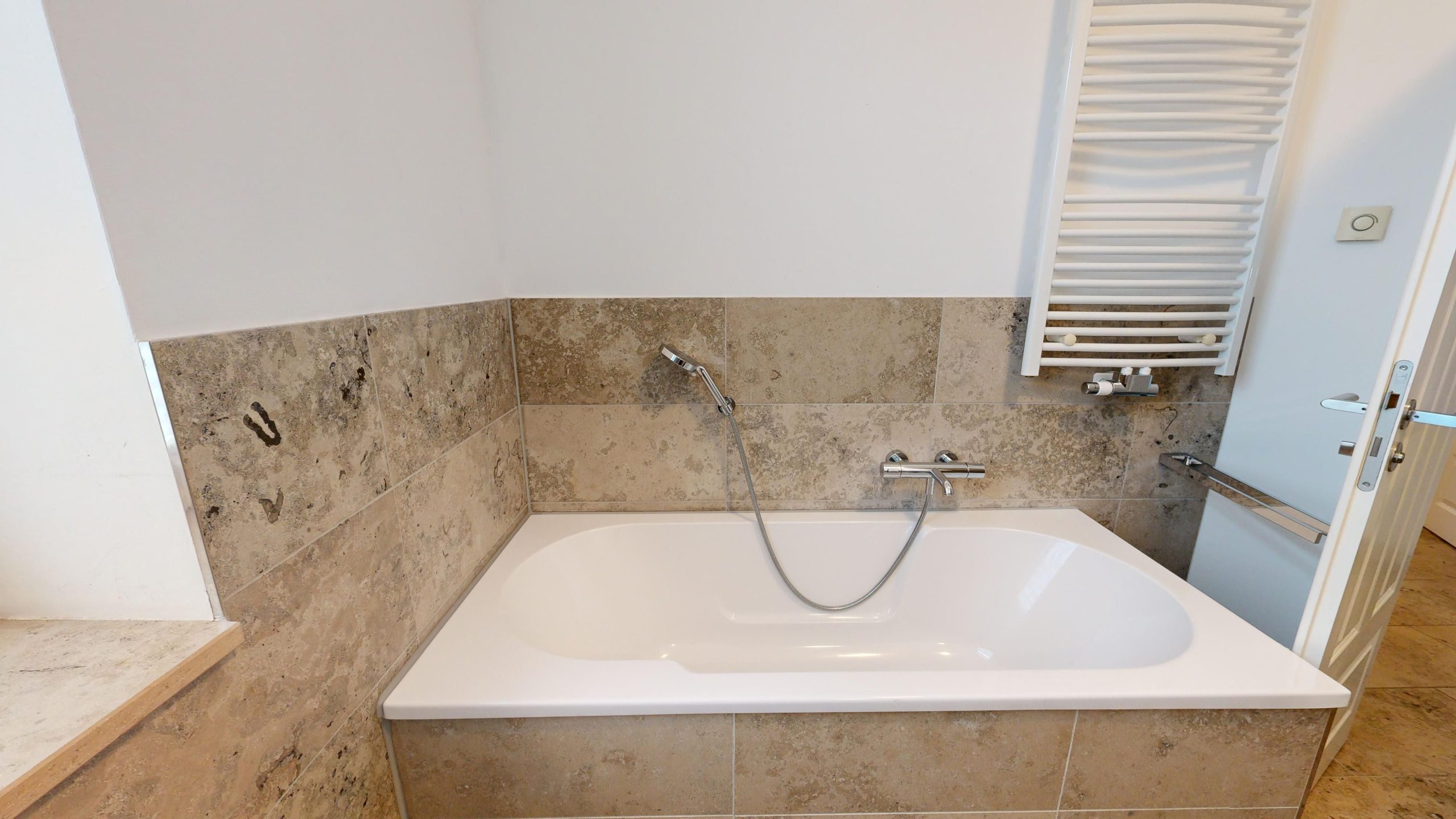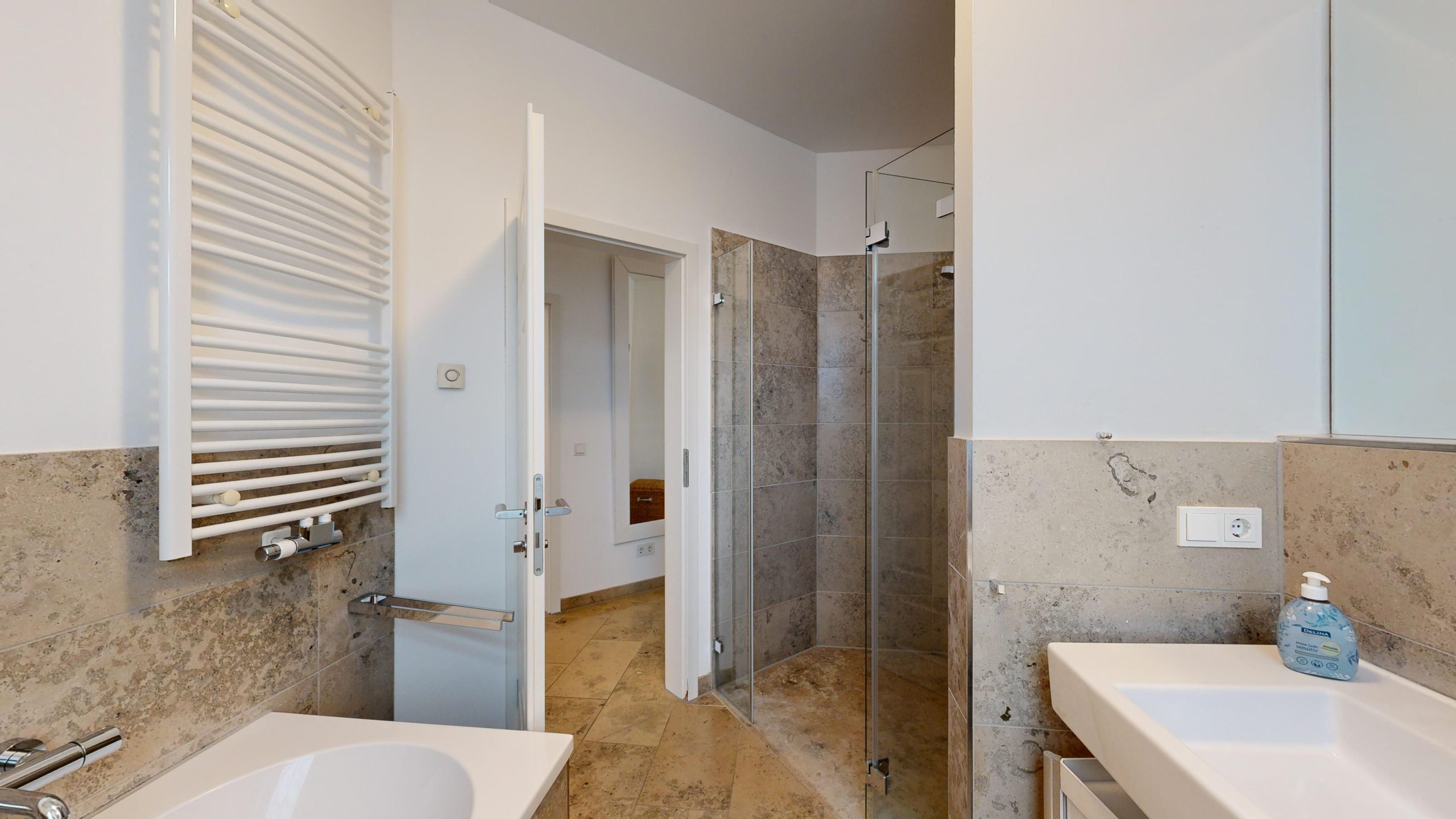 * Großes Badezimmer mit Dusche und Badewanne, Waschbecken, WC, Haartrockner, Handtuch-Heizkörper