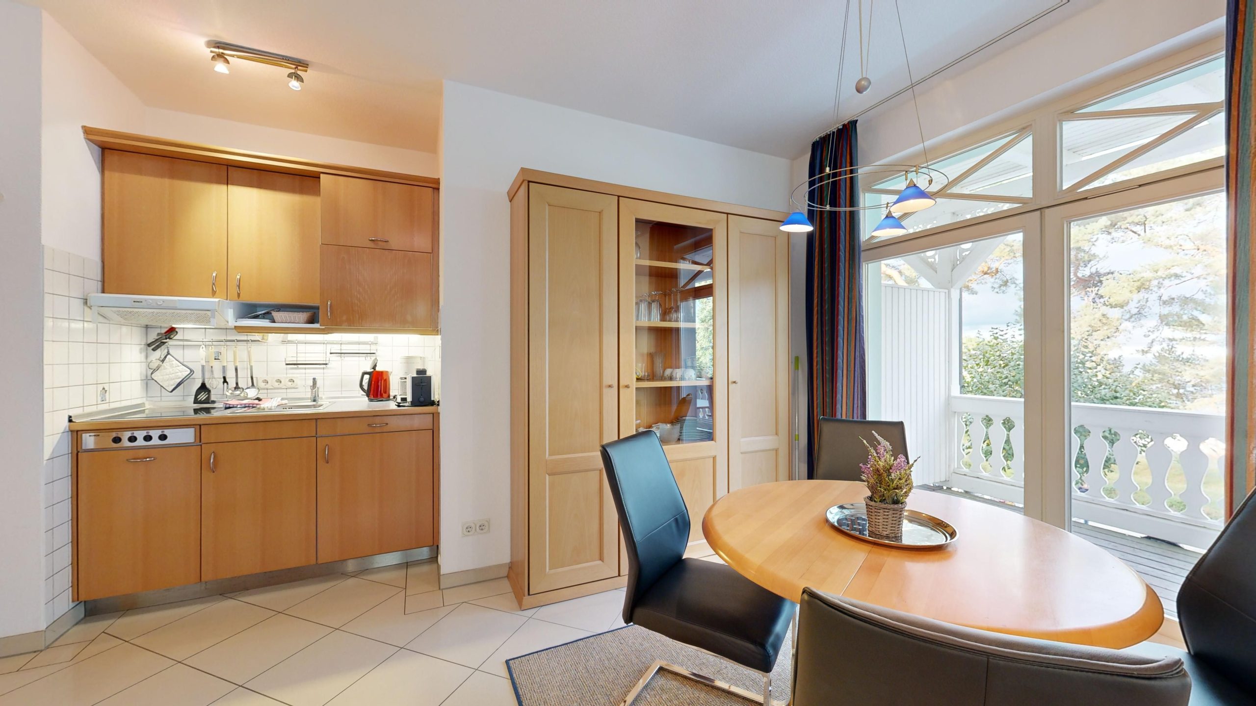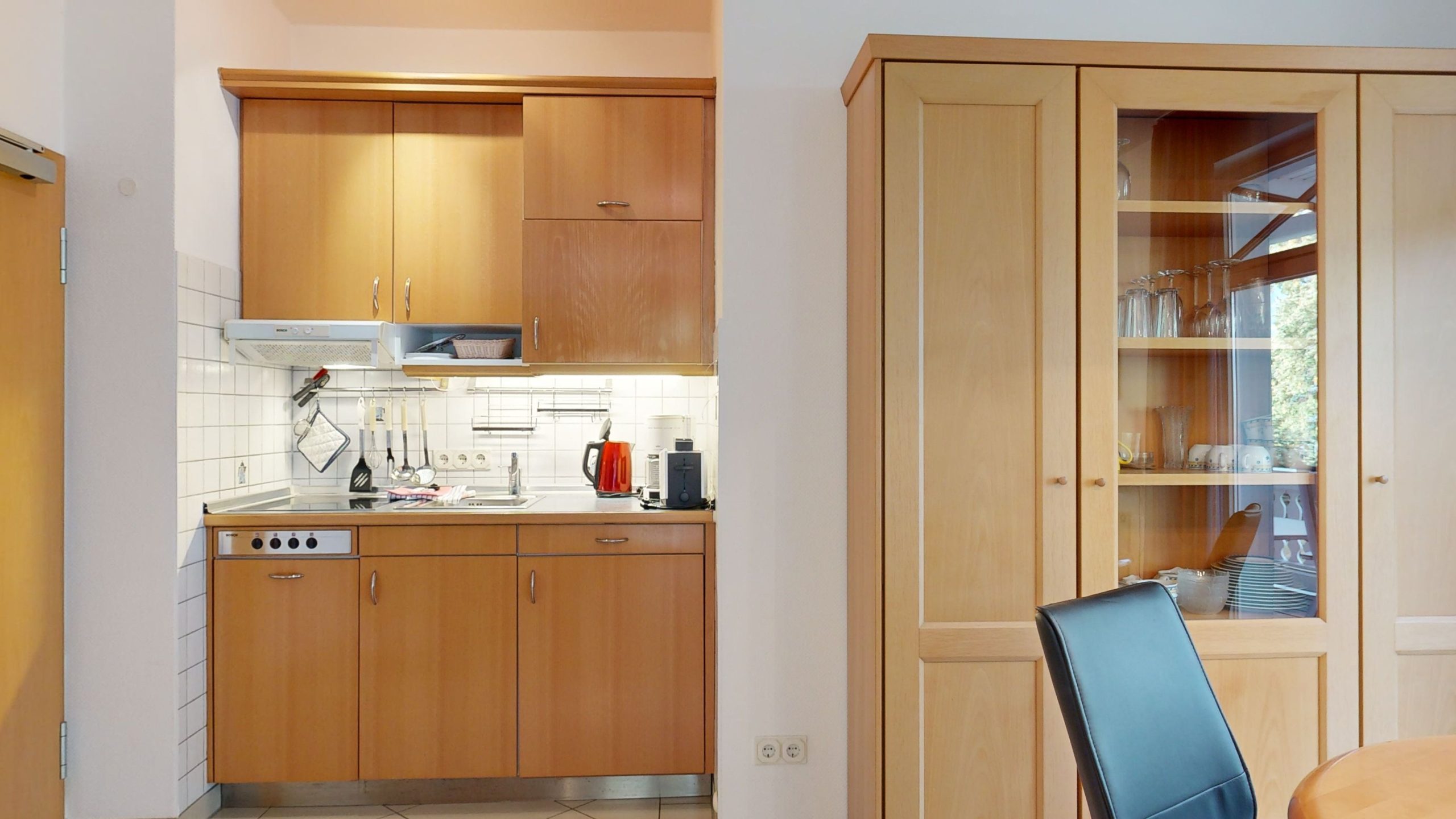 * Küche: Küchenzeile, Cerankochfeld, Spülmaschine, Mikrowelle (Grillen und Backen), Wasserkocher, Toaster, Kaffeemaschine