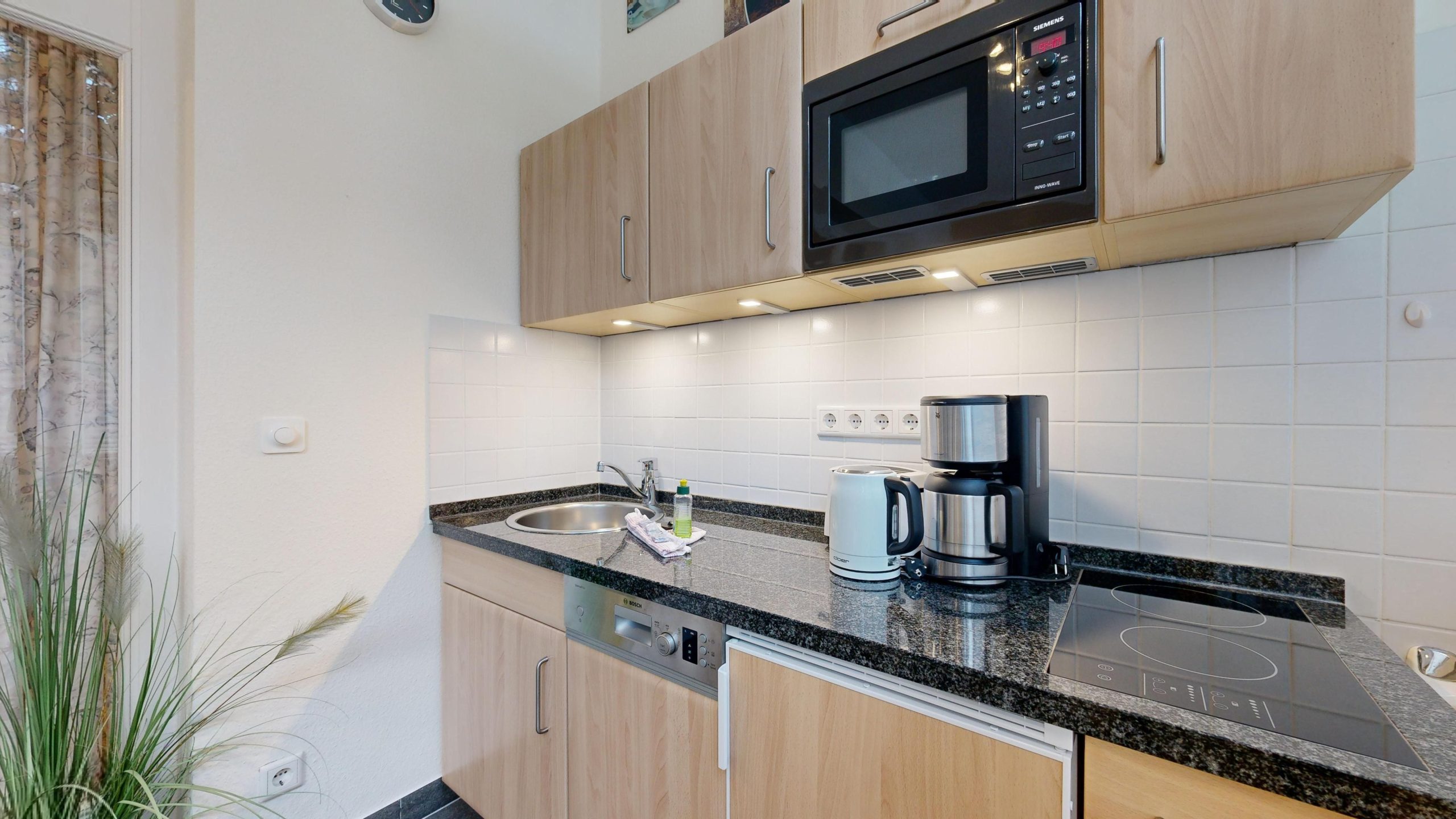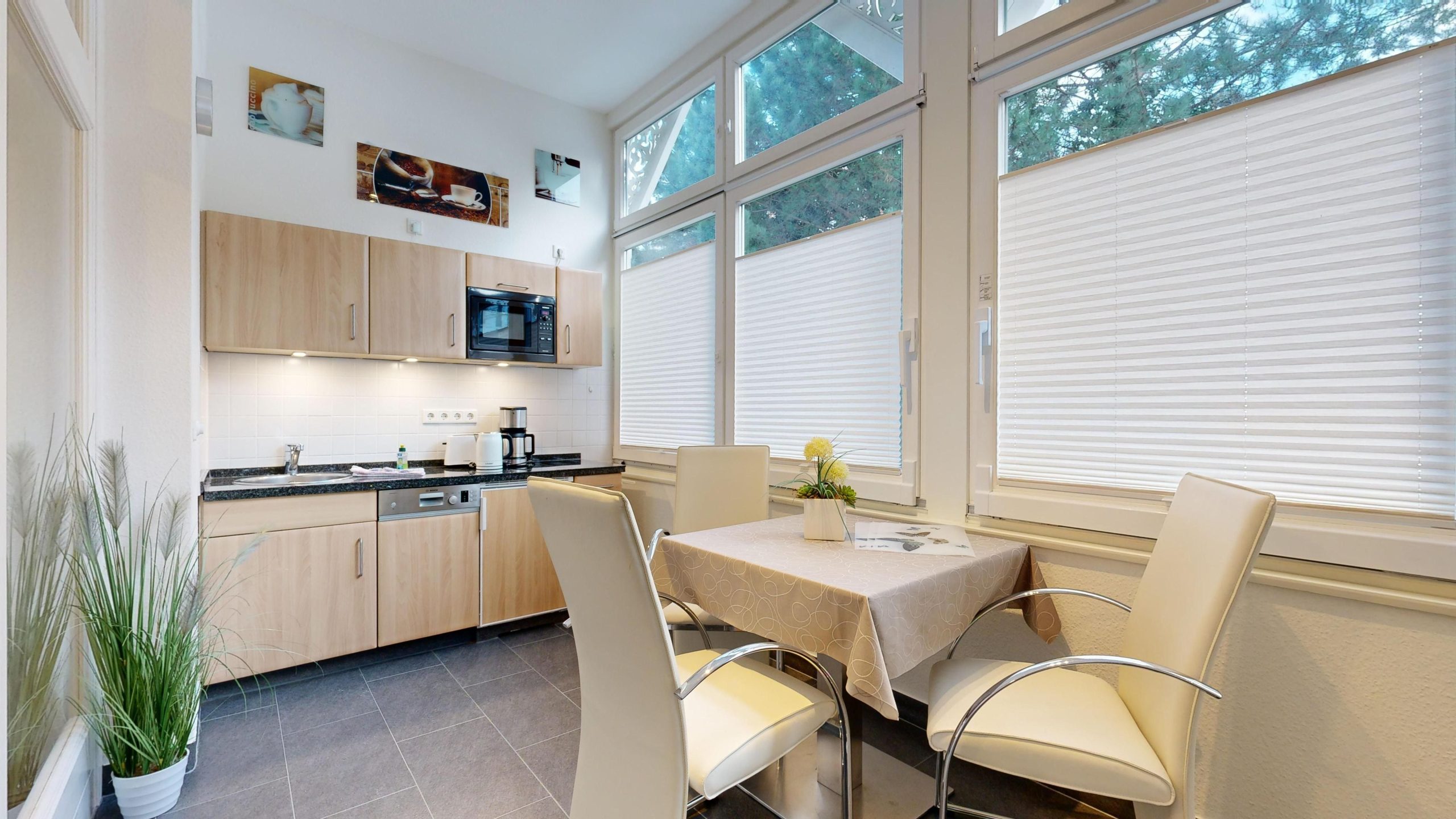 * Veranda: Essplatz, große Fensterfront, Küchenzeile mit Spülmaschine, Cerankochfeld mit 2 Platten, Mikrowelle, Toaster, Kaffeemaschine, Eierkocher, Wasserkocher