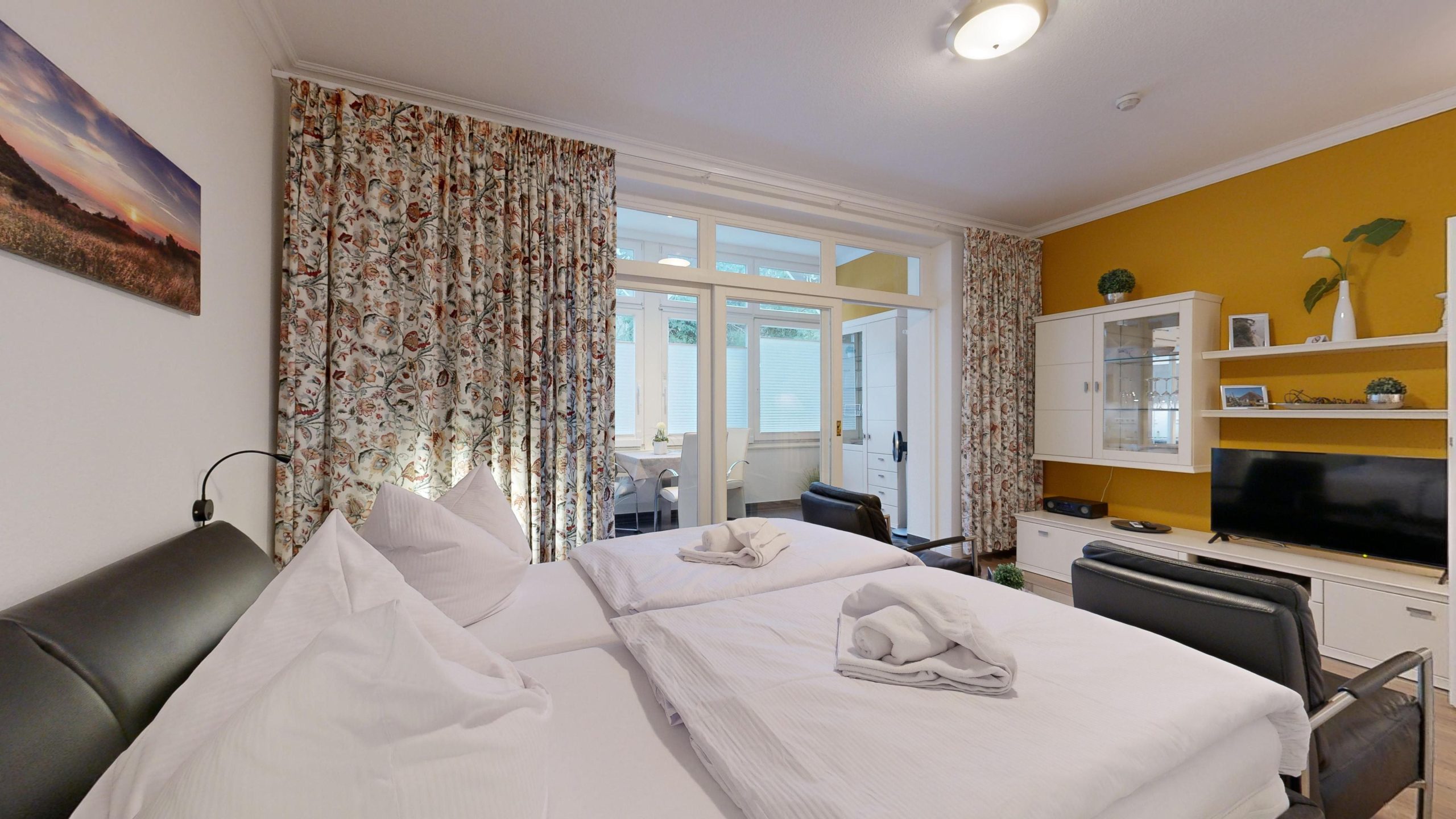 * Wohn-/Schlafraum: Doppelbett mit hochwertigen Federkernbetten, zwei gemütliche Sessel, Kabel-TV (Flachbild), Radio mit CD (Bluetoothfähig) + Blueray- Player