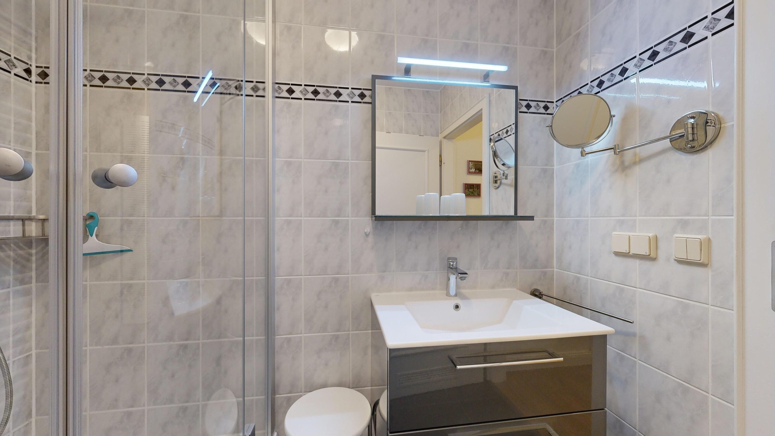 * 1 Badezimmer mit Dusche, WC und Föhn