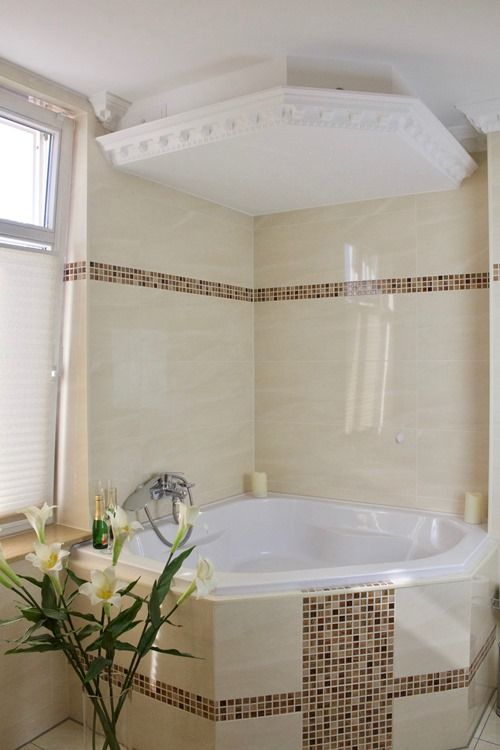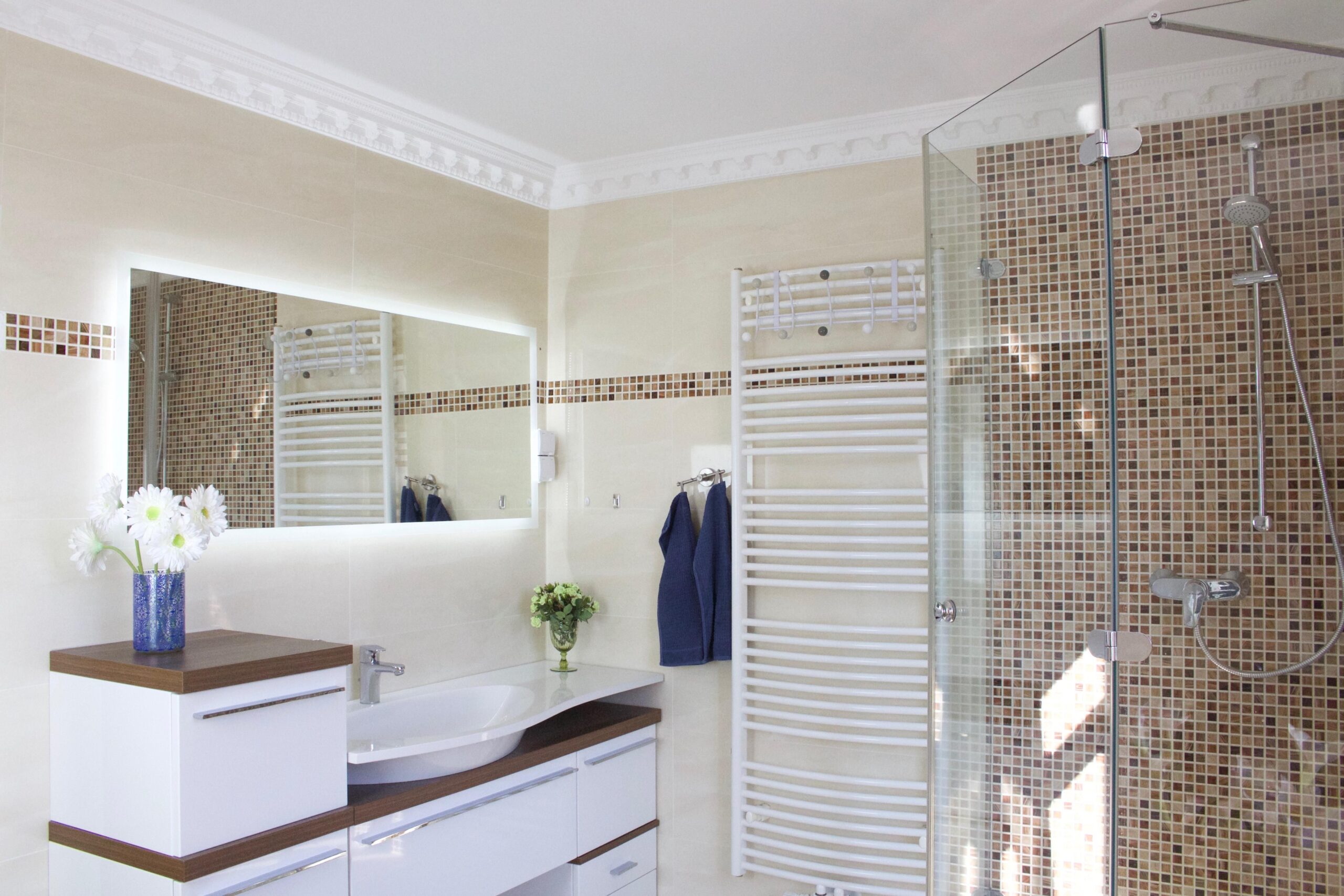 * Badezimmer mit Badewanne, Dusche, WC und Föhn