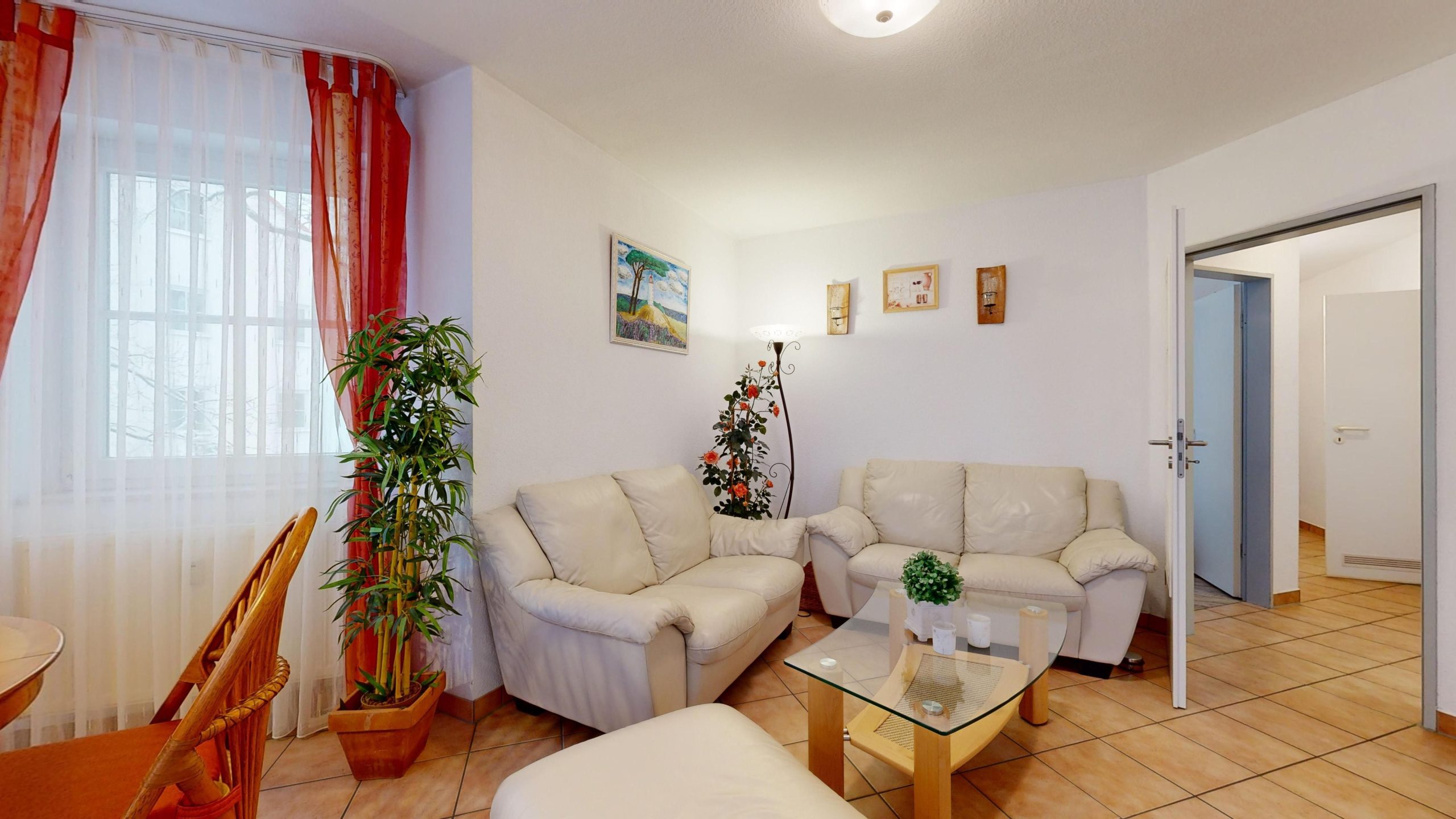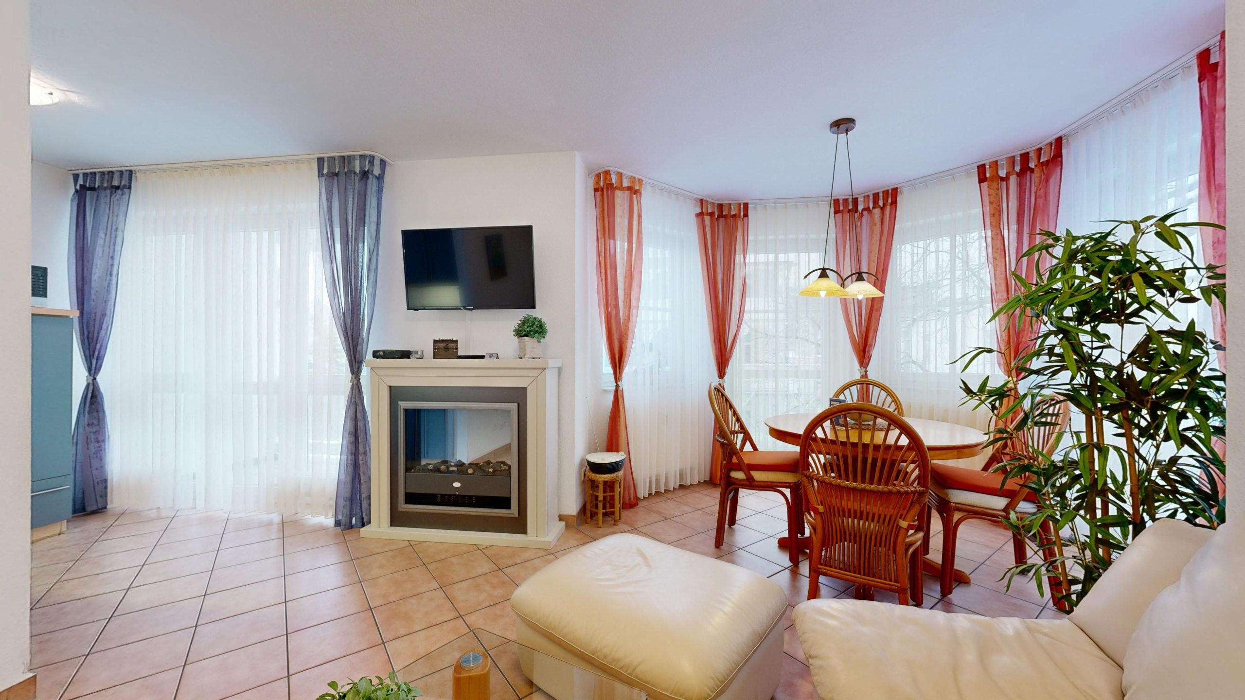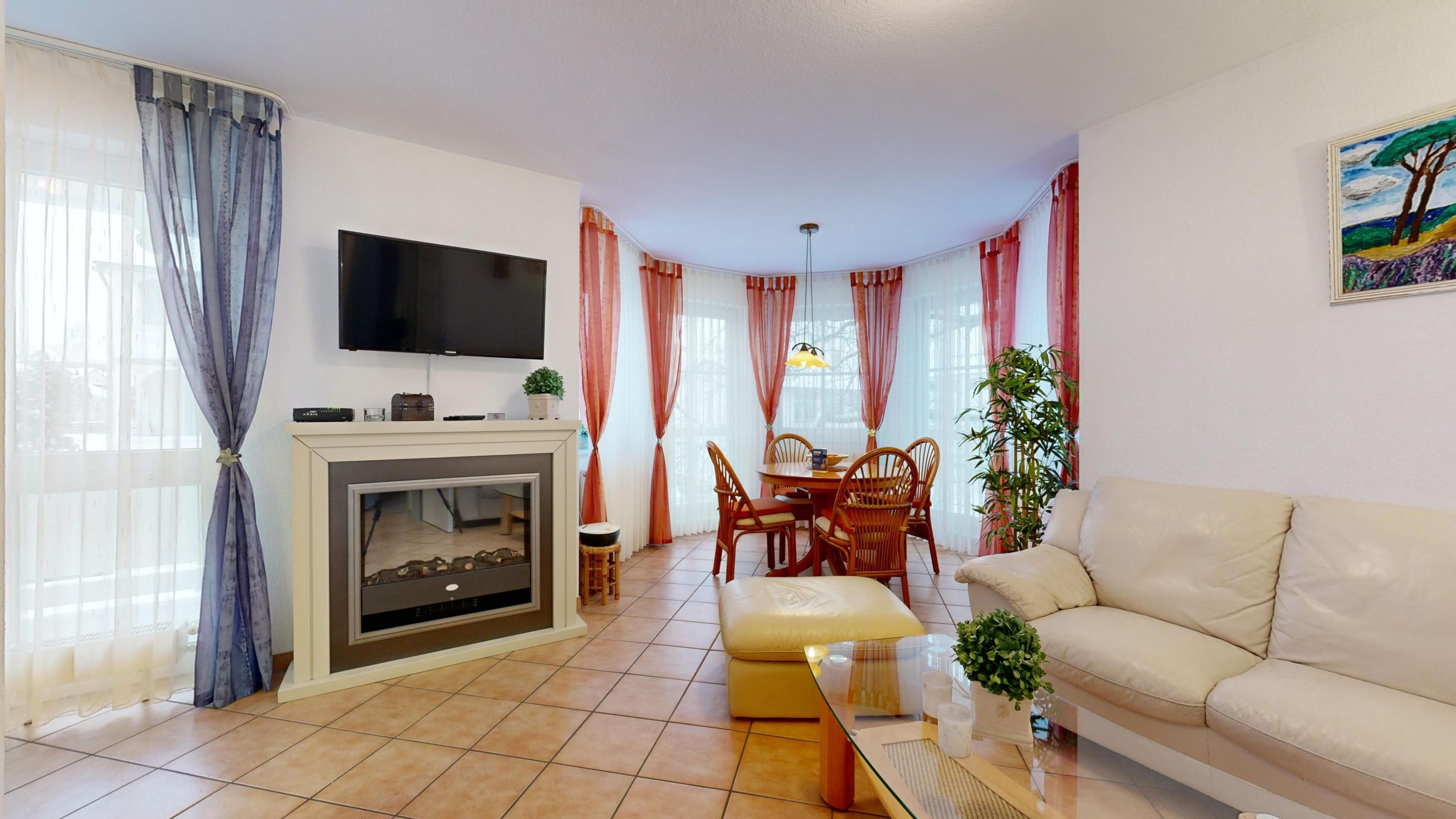 * Wohnzimmer: 2 Ledercouchen, Kabel-TV, Essplatz für 4 Personen im Erker, großer Elektrokamin und WLAN-Internetzugang; Ausgang zum Balkon